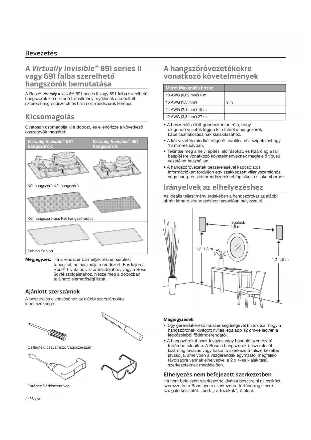 hivatalos viszonteladójához, vagy a Bose ügyfélszolgálatához. Nézze meg a dobozban található elérhetőségi listát. Ajánlott szerszámok A beszerelés elvégzéséhez az alábbi szerszámokra lehet szüksége: Csillagfejű csavarhúzó VágószerszámFúrógép Védőszemüveg A hangszóróvezetékekre vonatkozó követelmények Méret Maximális hossz 18 AWG (0,82 mm ) 6 m16 AWG (1,3 mm