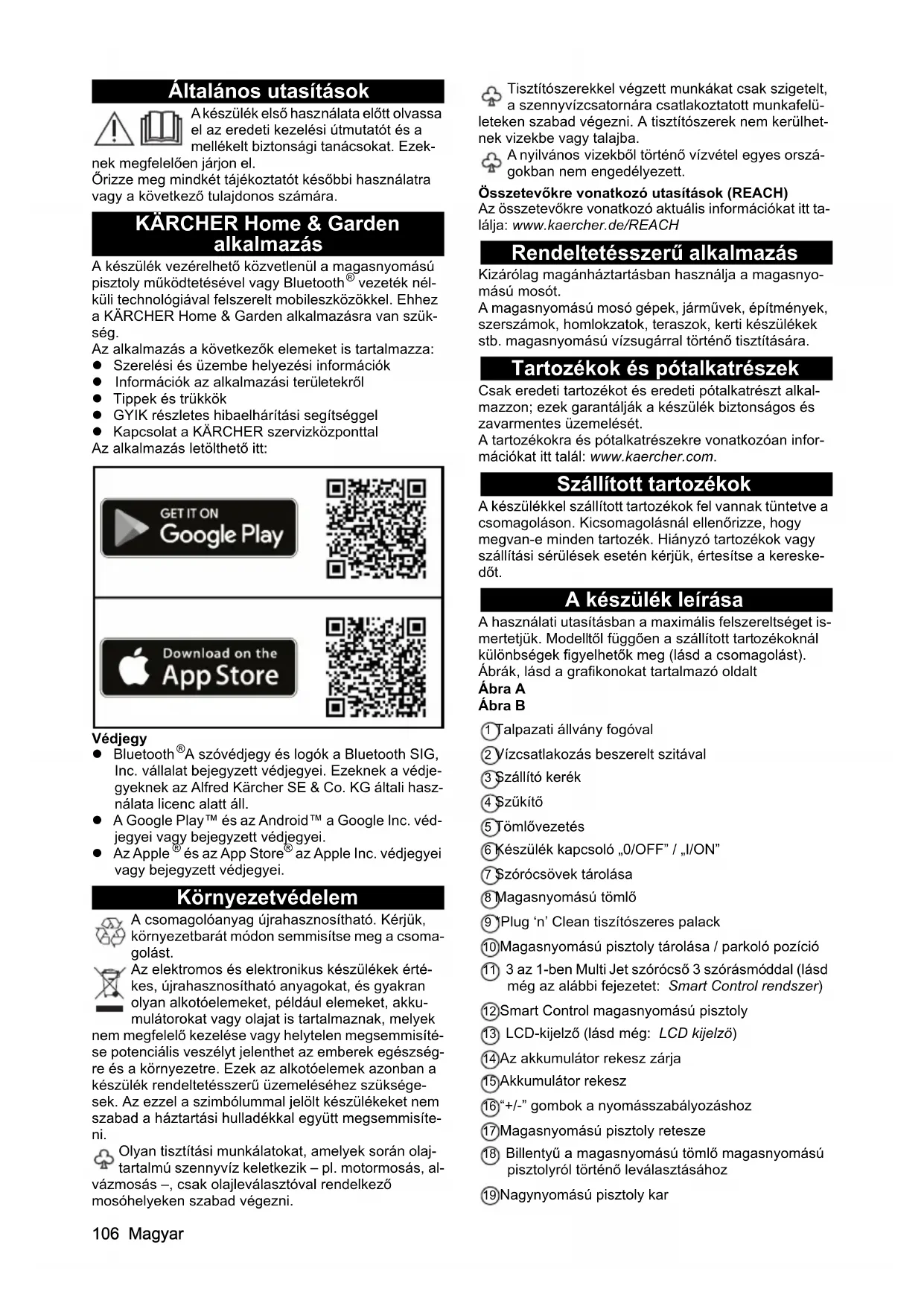 - EU-megfelelőségi nyilatkozat Chairman of the Board of Management Director Regulatory Affairs & Certification H. Jenner S. Reiser106 Magyar Általános utasítások A készülék első használata előtt olvassa el az eredeti kezelési útmutatót és a mellékelt biztonsági tanácsokat. Ezek- nek megfelelően járjon el. Őrizze meg mindkét tájékoztatót későbbi használatra vagy a következő tulajdonos számára. KÄRCHER Home & Garden alkalmazás A készülék vezérelhető közvetlenül a magasnyomású pisztoly működtetésével vagy Bluetooth p. 112