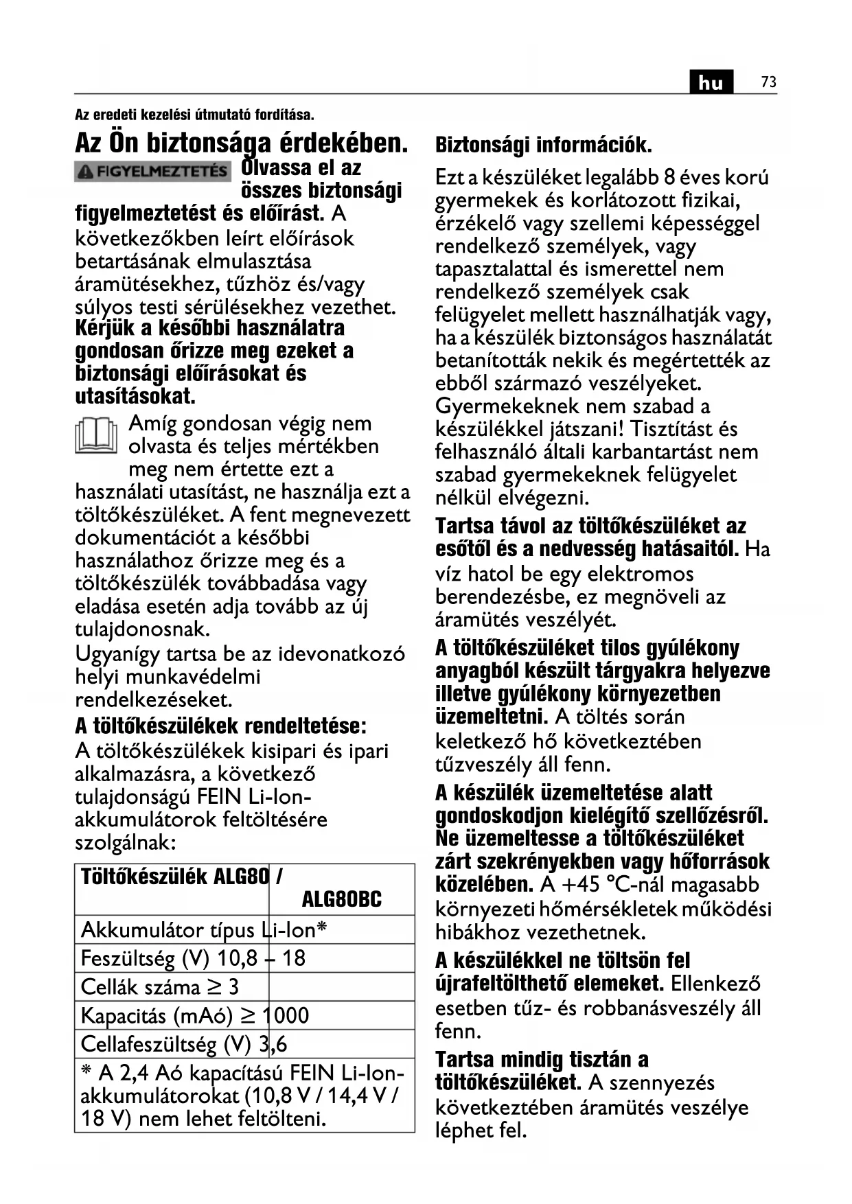 Az eredeti kezelési útmutató fordítása. Az Ön biztonsága érdekében. Olvassa el az összes biztonsági figyelmeztetést és előírást. A következőkben leírt előírások betartásának elmulasztása áramütésekhez, tűzhöz és/vagy súlyos testi sérülésekhez vezethet. Kérjük a későbbi használatra gondosan őrizze meg ezeket a biztonsági előírásokat és utasításokat. Amíg gondosan végig nem olvasta és teljes mértékben meg nem értette ezt a használati utasítást, ne használja ezt a töltőkészüléket. A fent megnevezett dokumentációt a későbbi használathoz őrizze meg és a töltőkészülék továbbadása vagy eladása esetén adja tovább az új tulajdonosnak. Ugyanígy tartsa be az idevonatkozó helyi munkavédelmi rendelkezéseket. A töltőkészülékek rendeltetése: A töltőkészülékek kisipari és ipari alkalmazásra, a következő tulajdonságú FEIN Li-Ion- akkumulátorok feltöltésére szolgálnak: Biztonsági információk. Ezt a készüléket legalább 8 éves korú gyermekek és korlátozott fizikai, érzékelő vagy szellemi képességgel rendelkező személyek, vagy tapasztalattal és ismerettel nem rendelkező személyek csak felügyelet mellett használhatják vagy, ha a készülék biztonságos használatát betanították nekik és megértették az ebből származó veszélyeket. Gyermekeknek nem szabad a készülékkel játszani! Tisztítást és felhasználó általi karbantartást nem szabad gyermekeknek felügyelet nélkül elvégezni. Tartsa távol az töltőkészüléket az esőtől és a nedvesség hatásaitól. Ha víz hatol be egy elektromos berendezésbe, ez megnöveli az áramütés veszélyét. A töltőkészüléket tilos gyúlékony anyagból készült tárgyakra helyezve illetve gyúlékony környezetben üzemeltetni. A töltés során keletkező hő következtében tűzveszély áll fenn. A készülék üzemeltetése alatt gondoskodjon kielégítő szellőzésről. Ne üzemeltesse a töltőkészüléket zárt szekrényekben vagy hőforrások közelében. A +45 °C-nál magasabb környezeti hőmérsékletek működési hibákhoz vezethetnek. A készülékkel ne töltsön fel újrafeltölthető elemeket. Ellenkező esetben tűz- és robbanásveszély áll fenn. Tartsa mindig tisztán a töltőkészüléket. A szennyezés következtében áramütés veszélye léphet fel. Töltőkészülék ALG80 / ALG80BC Akkumulátor típus Li-Ion* Feszültség (V) 10,8 – 18 Cellák száma ≥ 3 Kapacitás (mAó) ≥ 1000 Cellafeszültség (V) 3,6