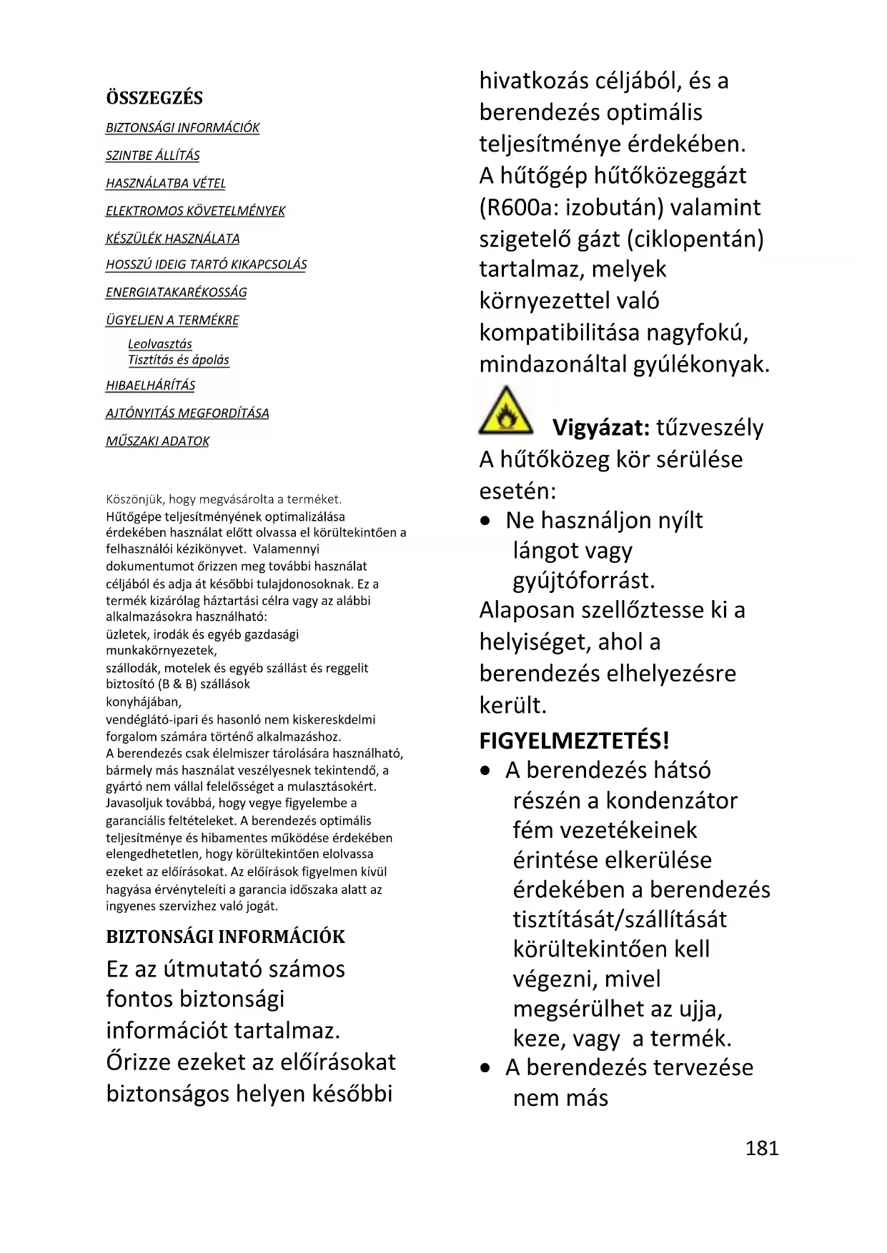 Ez az útmutató számos fontos biztonsági információt tartalmaz. Őrizze ezeket az előírásokat biztonságos helyen későbbi hivatkozás céljából, és a berendezés optimális teljesítménye érdekében. A hűtőgép hűtőközeggázt (R600a: izobután) valamint szigetelő gázt (ciklopentán) tartalmaz, melyek környezettel való kompatibilitása nagyfokú, mindazonáltal gyúlékonyak. Vigyázat: tűzveszély A hűtőközeg kör sérülése esetén: