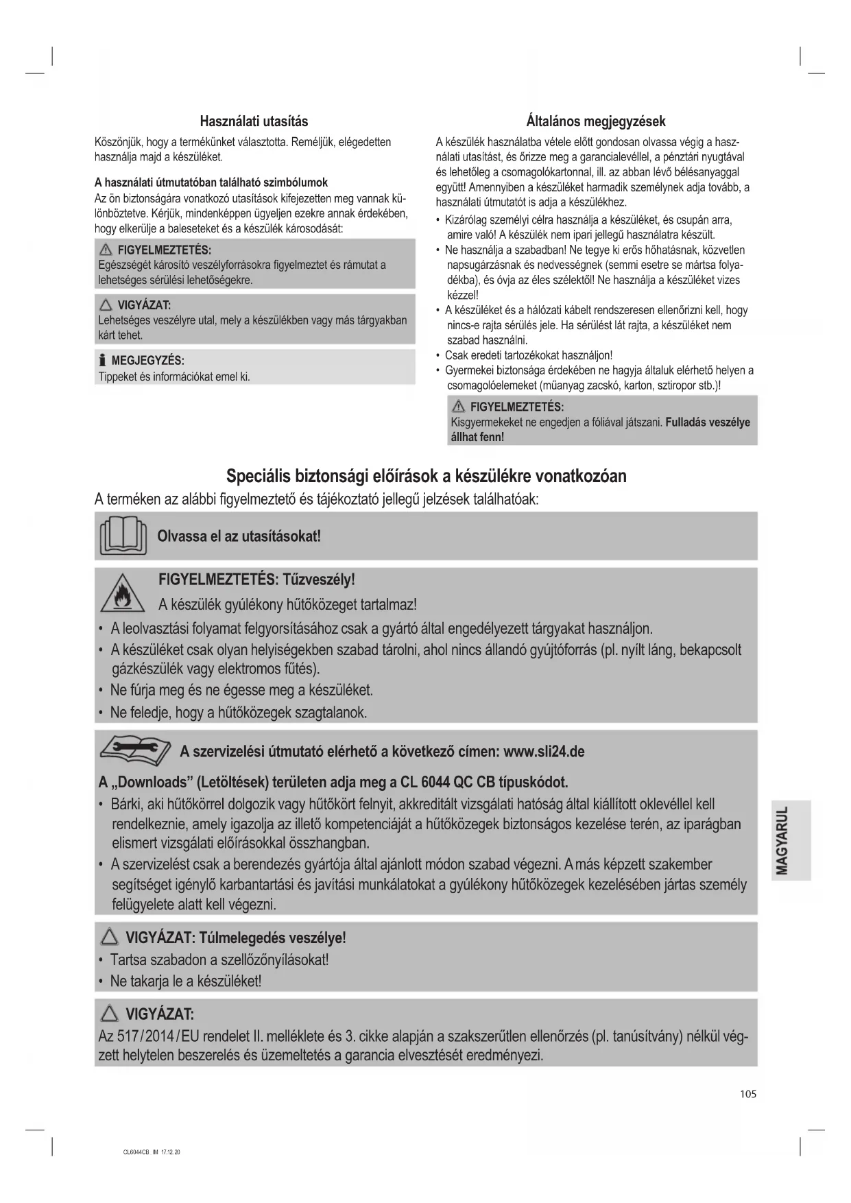 - Ne feledje, hogy a hűtőközegek szagtalanok. A szervizelési útmutató elérhető a következő címen: www.sli24.de A „Downloads” (Letöltések) területen adja meg a CL 6044 QC CB típuskódot.