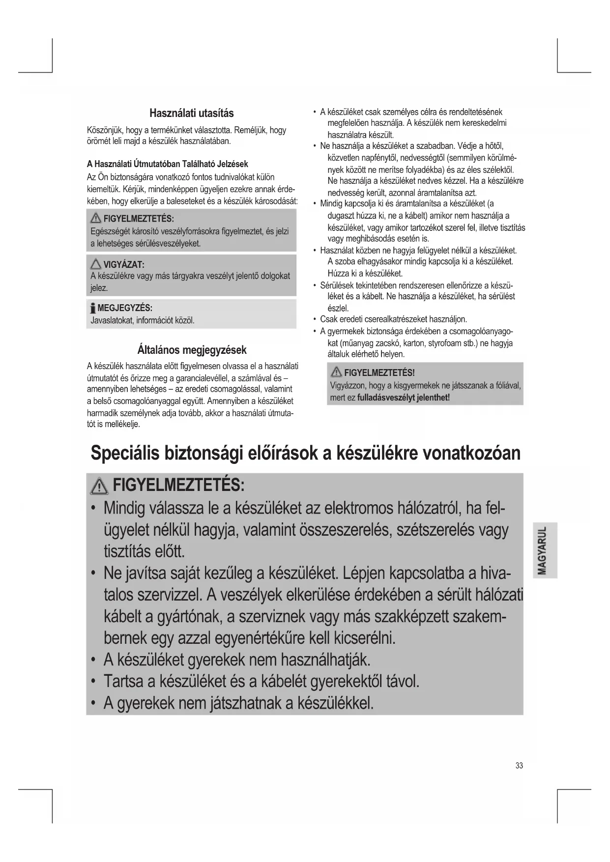 - A gyermekek biztonsága érdekében a csomagolóanyago- kat (műanyag zacskó, karton, styrofoam stb.) ne hagyja általuk elérhető helyen. FIGYELMEZTETÉS! Vigyázzon, hogy a kisgyermekek ne játsszanak a fóliával, mert ez fulladásveszélyt jelenthet! Használati utasítás Köszönjük, hogy a termékünket választotta. Reméljük, hogy örömét leli majd a készülék használatában. A Használati Útmutatóban Található Jelzések Az Ön biztonságára vonatkozó fontos tudnivalókat külön kiemeltük. Kérjük, mindenképpen ügyeljen ezekre annak érde- kében, hogy elkerülje a baleseteket és a készülék károsodását: FIGYELMEZTETÉS: Egészségét károsító veszélyforrásokra gyelmeztet, és jelzi a lehetséges sérülésveszélyeket. VIGYÁZAT: A készülékre vagy más tárgyakra veszélyt jelentő dolgokat jelez. MEGJEGYZÉS: Javaslatokat, információt közöl. Általános megjegyzések A készülék használata előtt gyelmesen olvassa el a használati útmutatót és őrizze meg a garancialevéllel, a számlával és – amennyiben lehetséges – az eredeti csomagolással, valamint a belső csomagolóanyaggal együtt. Amennyiben a készüléket harmadik személynek adja tovább, akkor a használati útmuta- tót is mellékelje. Speciális biztonsági előírások a készülékre vonatkozóan FIGYELMEZTETÉS: