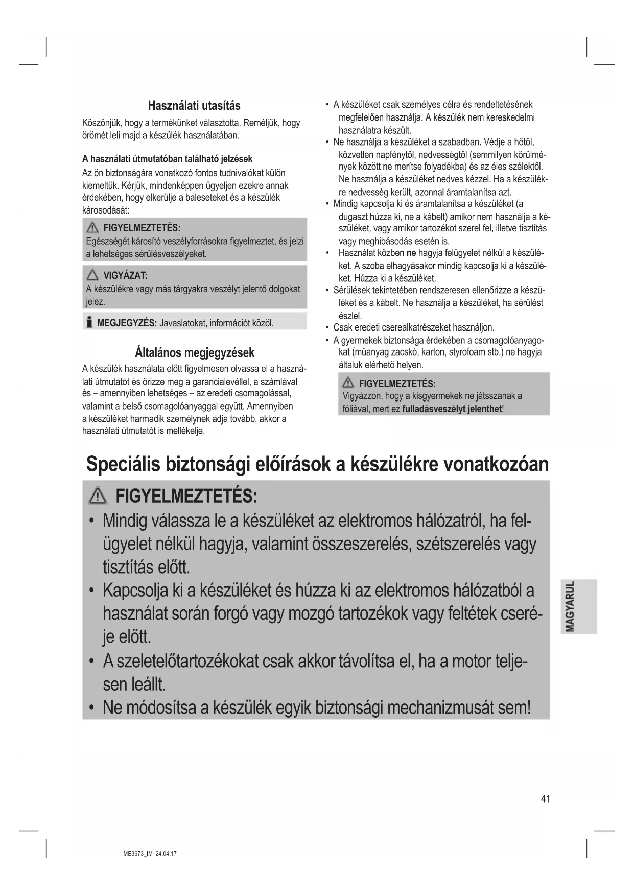- Ne módosítsa a készülék egyik biztonsági mechanizmusát sem!42 ME3673_IM 24.04.17 FIGYELMEZTETÉS: