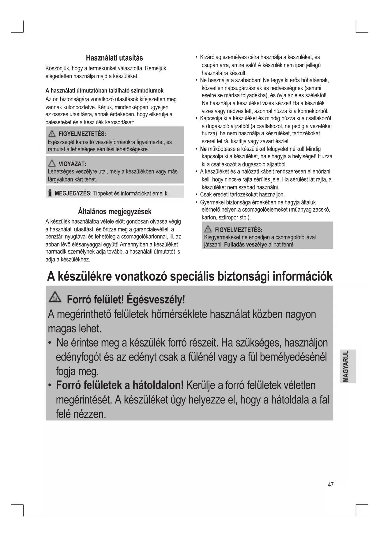 - Gyermekei biztonsága érdekében ne hagyja általuk elérhető helyen a csomagolóelemeket (műanyag zacskó, karton, sztiropor stb.). FIGYELMEZTETÉS: Kisgyermekeket ne engedjen a csomagolófóliával játszani. Fulladás veszélye állhat fenn! A készülékre vonatkozó speciális biztonsági információk Forró felület! Égésveszély! A megérinthető felületek hőmérséklete használat közben nagyon magas lehet.