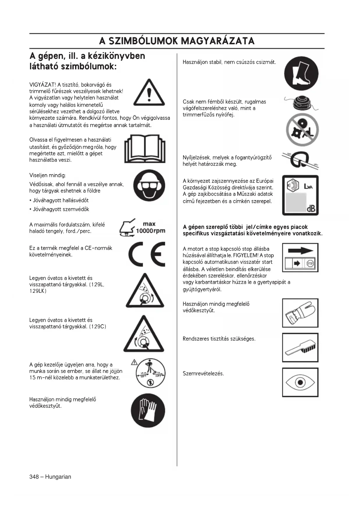 - Jóváhagyott szemvédŒk A maximális fordulatszám, kifelé haladó tengely, ford./perc. Ez a termék megfelel a CE-normák követelményeinek. Legyen óvatos a kivetett és visszapattanó tárgyakkal. (129L, 129LK) Legyen óvatos a kivetett és visszapattanó tárgyakkal. (129C) A gép kezelŒje ügyeljen arra, hogy a munka során se ember, se állat ne jöjjön 15 m-nél közelebb a munkaterülethez. Használjon mindig megfelelŒ védŒkesztyıt. Használjon stabil, nem csúszós csizmát. Csak nem fémbŒl készült, rugalmas vágófelszereléshez való, mint a trimmerfızŒs nyírófej. Nyíljelzések, melyek a fogantyúrögzítŒ helyét határozzák meg. A környezet zajszennyezése az Európai Gazdasági Közösség direktívája szerint. A gép zajkibocsátása a Mıszaki adatok címı fejezetben és a címkén szerepel. A gépen szereplŒ többi jel/címke egyes piacok specifikus vizsgáztatási követelményeire vonatkozik. A motort a stop kapcsoló stop állásba húzásával állíthatja le. FIGYELEM! A stop kapcsoló automatikusan visszatér start állásba. A véletlen beindítás elkerülése érdekében szereléskor, ellenŒrzéskor vagy karbantartáskor húzza le a gyertyapipát a gyújtógyertyáról. Használjon mindig megfelelŒ védŒkesztyıt. Rendszeres tisztítás szükséges. Szemrevételezés.