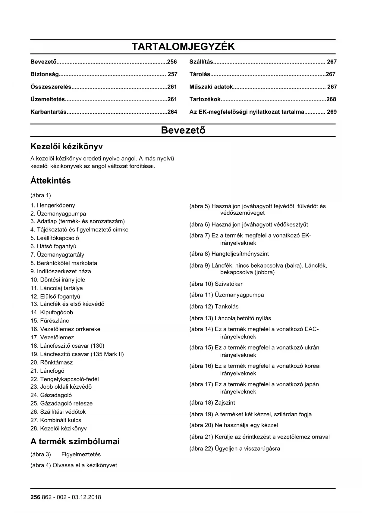 A termék szimbólumai (ábra 3) Figyelmeztetés (ábra 4) Olvassa el a kézikönyvet (ábra 5) Használjon jóváhagyott fejvédőt, fülvédőt és védőszemüveget (ábra 6) Használjon jóváhagyott védőkesztyűt (ábra 7) Ez a termék megfelel a vonatkozó EK- irányelveknek (ábra 8) Hangteljesítményszint (ábra 9) Láncfék, nincs bekapcsolva (balra). Láncfék, bekapcsolva (jobbra) (ábra 10) Szívatókar (ábra 11) Üzemanyagpumpa (ábra 12) Tankolás (ábra 13) Láncolajbetöltő nyílás (ábra 14) Ez a termék megfelel a vonatkozó EAC- irányelveknek (ábra 15) Ez a termék megfelel a vonatkozó ukrán irányelveknek (ábra 16) Ez a termék megfelel a vonatkozó koreai irányelveknek (ábra 17) Ez a termék megfelel a vonatkozó japán irányelveknek (ábra 18) Zajszint (ábra 19) A terméket két kézzel, szilárdan fogja (ábra 20) Ne használja egy kézzel (ábra 21) Kerülje az érintkezést a vezetőlemez orrával (ábra 22) Ügyeljen a visszarúgásra 256 862 - 002 - 03.12.2018(ábra 23) Ez a termék megfelel a vonatkozó elektromágneses megfelelőségre irányuló ausztrál és új-zélandi irányelveknek. Megjegyzés: A terméken szereplő többi jelölés/címke a további piacok specifikus vizsgáztatási követelményeire vonatkozik. Proposition 65 (ábra 1) EU V FIGYELMEZTETÉS: A motor módosítása érvényteleníti a termékre vonatkozó európai uniós típusjóváhagyást. Termékszavatosság A termékszavatosságra vonatkozó jogszabályok értelmében nem vagyunk felelősek a termékeink által okozott károkért az alábbi esetekben: