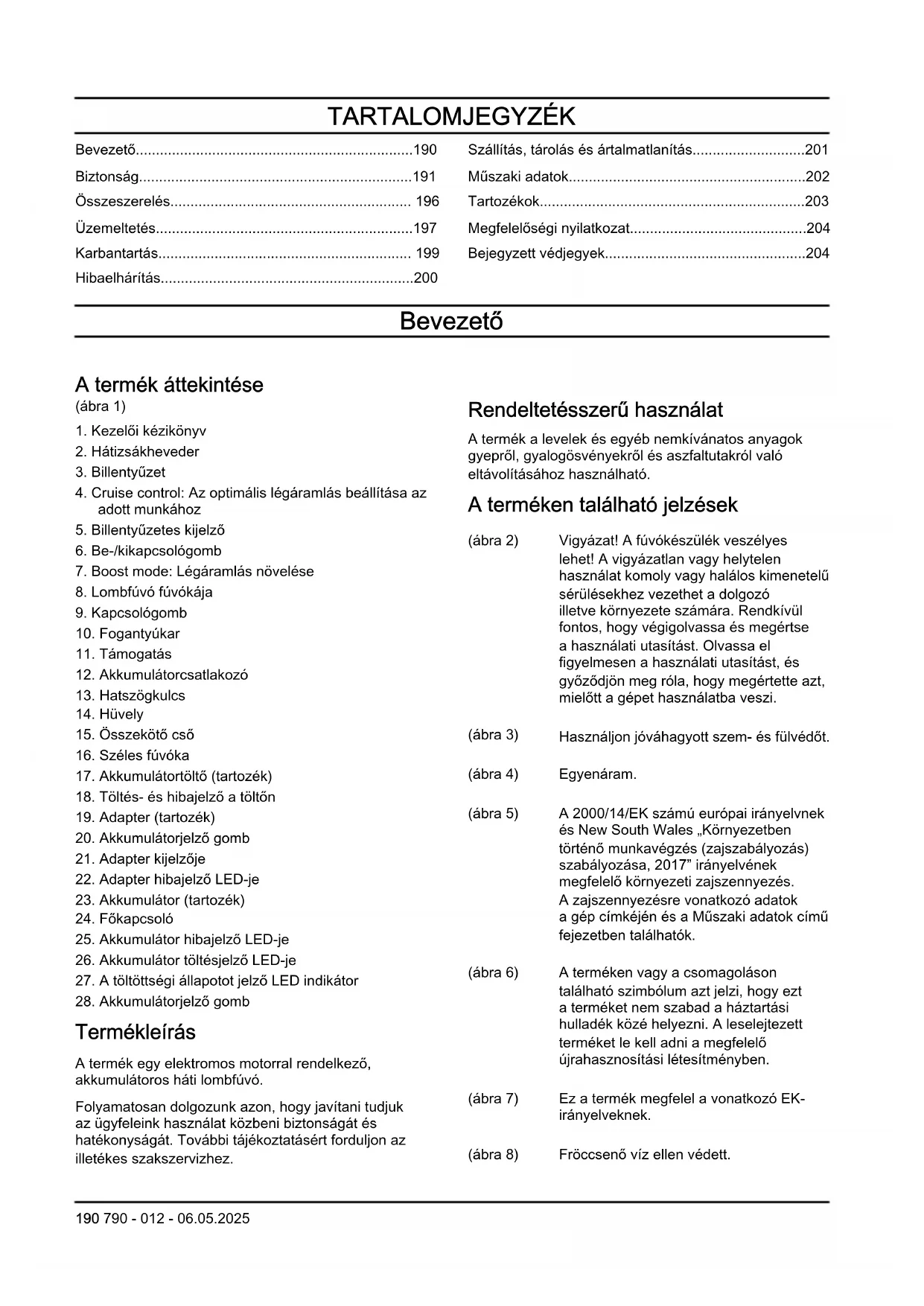 Termékleírás A termék egy elektromos motorral rendelkező, akkumulátoros háti lombfúvó. Folyamatosan dolgozunk azon, hogy javítani tudjuk az ügyfeleink használat közbeni biztonságát és hatékonyságát. További tájékoztatásért forduljon az illetékes szakszervizhez. Rendeltetésszerű használat A termék a levelek és egyéb nemkívánatos anyagok gyepről, gyalogösvényekről és aszfaltutakról való eltávolításához használható. A terméken található jelzések (ábra 2) Vigyázat! A fúvókészülék veszélyes lehet! A vigyázatlan vagy helytelen használat komoly vagy halálos kimenetelű sérülésekhez vezethet a dolgozó illetve környezete számára. Rendkívül fontos, hogy végigolvassa és megértse a használati utasítást. Olvassa el figyelmesen a használati utasítást, és győződjön meg róla, hogy megértette azt, mielőtt a gépet használatba veszi. (ábra 3) Használjon jóváhagyott szem- és fülvédőt. (ábra 4) Egyenáram. (ábra 5) A 2000/14/EK számú európai irányelvnek és New South Wales „Környezetben történő munkavégzés (zajszabályozás) szabályozása, 2017” irányelvének megfelelő környezeti zajszennyezés. A zajszennyezésre vonatkozó adatok a gép címkéjén és a Műszaki adatok című fejezetben találhatók. (ábra 6) A terméken vagy a csomagoláson található szimbólum azt jelzi, hogy ezt a terméket nem szabad a háztartási hulladék közé helyezni. A leselejtezett terméket le kell adni a megfelelő újrahasznosítási létesítményben. (ábra 7) Ez a termék megfelel a vonatkozó EK- irányelveknek. (ábra 8) Fröccsenő víz ellen védett. 190 790 - 012 - 06.05.2025(ábra 9) Figyelmeztető LED (ábra 10) Be-/kikapcsológomb (ábra 11) Boost mode gomb (ábra 12) Cruise control gomb (ábra 13) Ha a termék Bluetooth