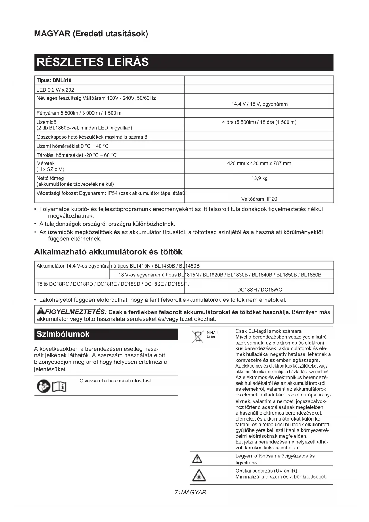 - Lakóhelyétől függően előfordulhat, hogy a fent felsorolt akkumulátorok és töltők nem érhetők el. FIGYELMEZTETÉS: Csak a fentiekben felsorolt akkumulátorokat és töltőket használja. Bármilyen más akkumulátor vagy töltő használata sérüléseket és/vagy tüzet okozhat. Szimbólumok A következőkben a berendezésen esetleg hasz- nált jelképek láthatók. A szerszám használata előtt bizonyosodjon meg arról hogy helyesen értelmezi a jelentésüket. Olvassa el a használati utasítást. Ni-MH Li-ion Csak EU-tagállamok számára Mivel a berendezésben veszélyes alkatré- szek vannak, az elektromos és elektroni- kus berendezések, akkumulátorok és ele- mek hulladékai negatív hatással lehetnek a környezetre és az emberi egészségre. Az elektromos és elektronikus készülékeket vagy akkumulátorokat ne dobja a háztartási szemétbe! Az elektromos és elektronikus berendezé- sek hulladékairól és az akkumulátorokról és elemekről, valamint az akkumulátorok és elemek hulladékáról szóló európai irány- elvnek, valamint a nemzeti jogszabályok- hoz történő adaptálásának megfelelően a használt elektromos berendezéseket, elemeket és akkumulátorokat külön kell tárolni, és a települési hulladék elkülönített gyűjtőhelyére kell szállítani a környezetvé- delmi előírásoknak megfelelően. Ezt jelzi a berendezésen elhelyezett áthú- zott kerekes kuka szimbólum. Legyen különösen elővigyázatos és gyelmes. Optikai sugárzás (UV és IR). Minimalizálja a szem és a bőr kitettségét.72 MAGYAR Ne bámuljon a működő lámpába. Használjon megfelelő árnyékolást vagy szemvédelmet. Ne használja a készüléket esőben vagy hóban, ha váltóáramról használja. Megszakító újraindító gombja. Megjegyzés Ez a termék <C> és <D> energiahatékonysági osztályú fényforrásokat tartalmaz. Tápegység A szerszám csak a névtáblán feltüntetett feszültségű, egyfázisú váltakozófeszültségű hálózathoz csatlakoz- tatható. Ezt a szerszámot használat közben földelni kell a kezelő személyzet áramütés elleni védelmére. Csak olyan háromvezetékes hosszabító kábelt használjon amelynek három érintkezős csatlakozódugója és olyan három érintkezős aljzata van amely illeszkedik a készü- lék csatlakozójához. BIZTONSÁGI FIGYELMEZTETÉS