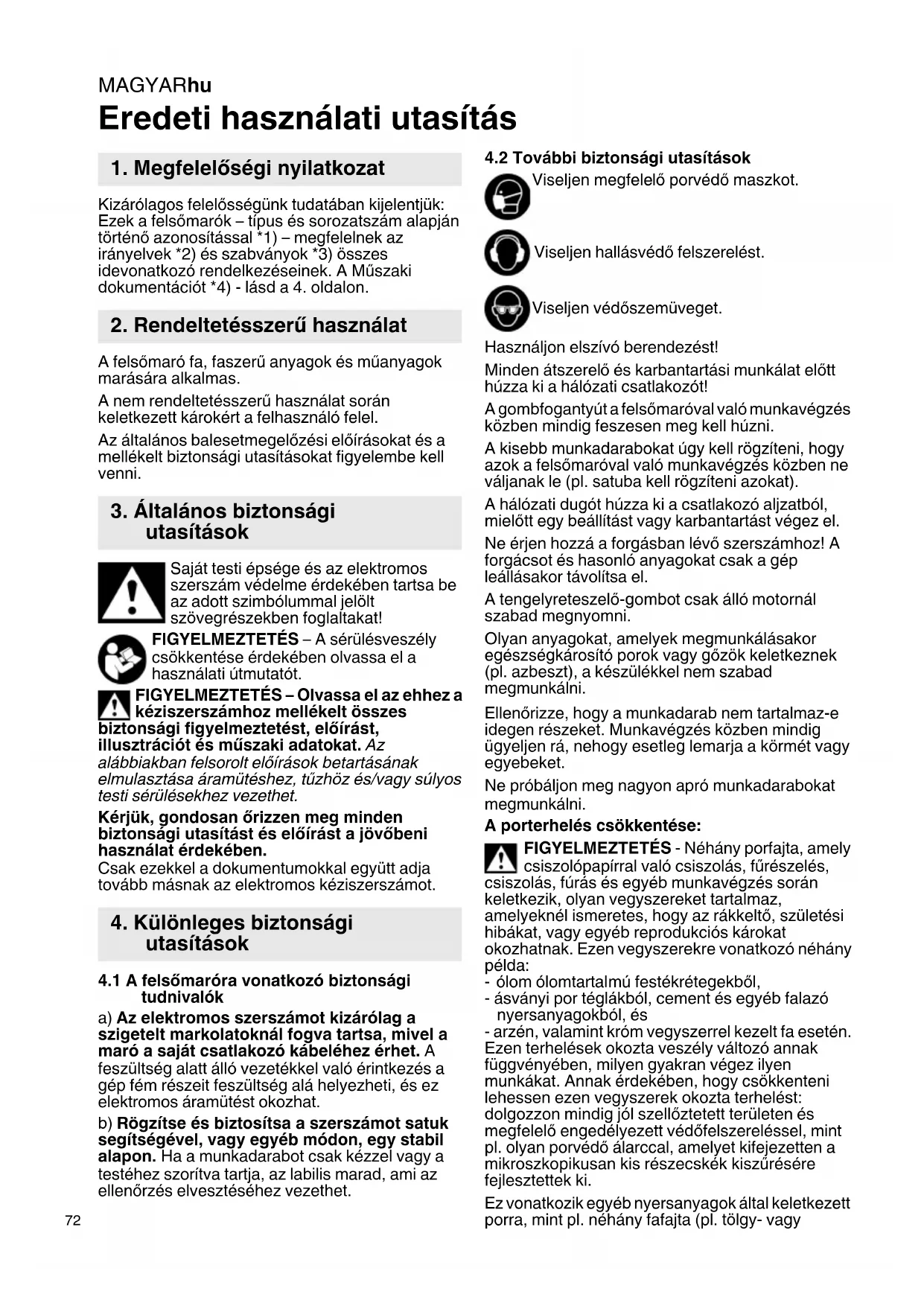 Eredeti használati utasítás Kizárólagos felelősségünk tudatában kijelentjük: Ezek a felsőmarók – típus és sorozatszám alapján történő azonosítással *1) – megfelelnek az irányelvek *2) és szabványok *3) összes idevonatkozó rendelkezéseinek. A Műszaki dokumentációt *4) - lásd a 4. oldalon. A felsőmaró fa, faszerű anyagok és műanyagok marására alkalmas. A nem rendeltetésszerű használat során keletkezett károkért a felhasználó felel. Az általános balesetmegelőzési előírásokat és a mellékelt biztonsági utasításokat figyelembe kell venni. Saját testi épsége és az elektromos szerszám védelme érdekében tartsa be az adott szimbólummal jelölt szövegrészekben foglaltakat! FIGYELMEZTETÉS – A sérülésveszély csökkentése érdekében olvassa el a használati útmutatót. FIGYELMEZTETÉS – Olvassa el az ehhez a kéziszerszámhoz mellékelt összes biztonsági figyelmeztetést, előírást, illusztrációt és műszaki adatokat. Az alábbiakban felsorolt előírások betartásának elmulasztása áramütéshez, tűzhöz és/vagy súlyos testi sérülésekhez vezethet. Kérjük, gondosan őrizzen meg minden biztonsági utasítást és előírást a jövőbeni használat érdekében. Csak ezekkel a dokumentumokkal együtt adja tovább másnak az elektromos kéziszerszámot.