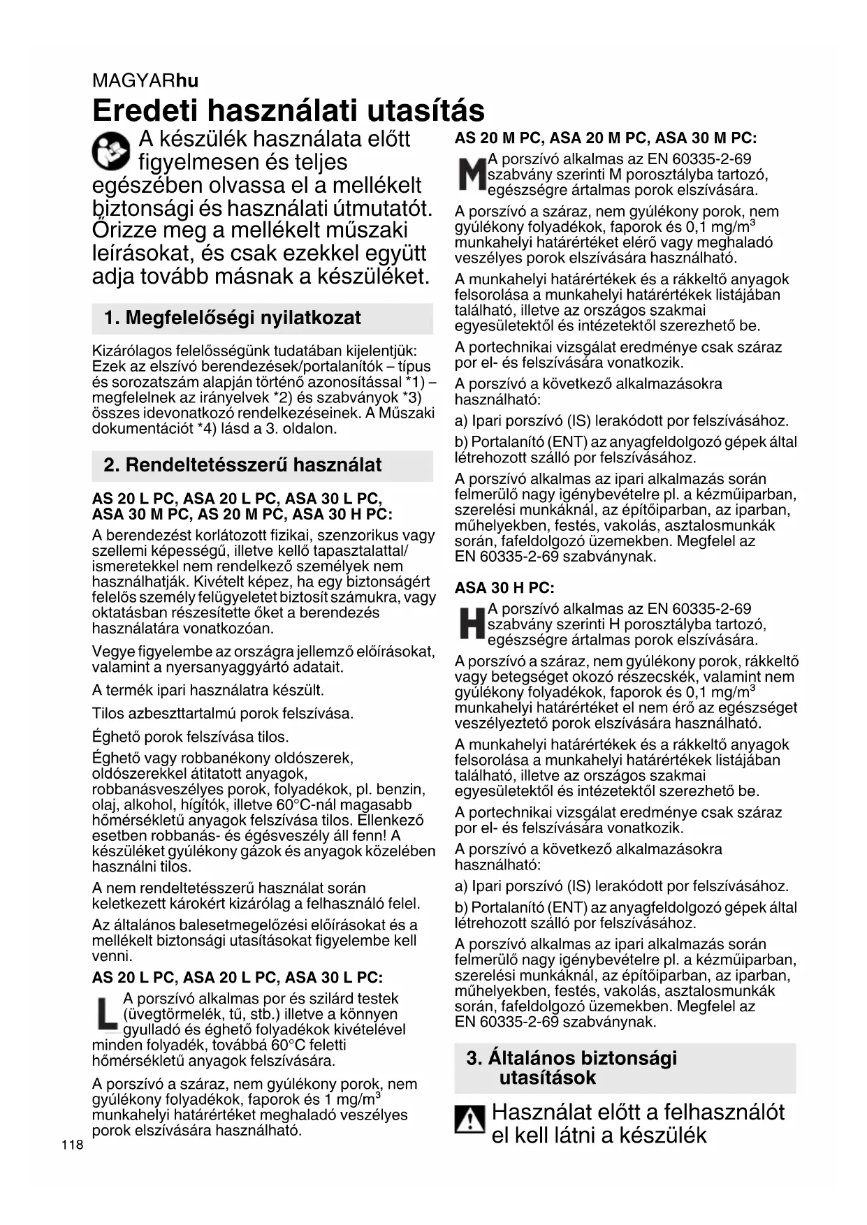 Eredeti használati utasítás A készülék használata előtt figyelmesen és teljes egészében olvassa el a mellékelt biztonsági és használati útmutatót. Őrizze meg a mellékelt műszaki leírásokat, és csak ezekkel együtt adja tovább másnak a készüléket. Kizárólagos felelősségünk tudatában kijelentjük: Ezek az elszívó berendezések/portalanítók – típus és sorozatszám alapján történő azonosítással *1) – megfelelnek az irányelvek *2) és szabványok *3) összes idevonatkozó rendelkezéseinek. A Műszaki dokumentációt *4) lásd a 3. oldalon. AS 20 L PC, ASA 20 L PC, ASA 30 L PC, ASA 30 M PC, AS 20 M PC, ASA 30 H PC: A berendezést korlátozott fizikai, szenzorikus vagy szellemi képességű, illetve kellő tapasztalattal/ ismeretekkel nem rendelkező személyek nem használhatják. Kivételt képez, ha egy biztonságért felelős személy felügyeletet biztosít számukra, vagy oktatásban részesítette őket a berendezés használatára vonatkozóan. Vegye figyelembe az országra jellemző előírásokat, valamint a nyersanyaggyártó adatait. A termék ipari használatra készült. Tilos azbeszttartalmú porok felszívása. Éghető porok felszívása tilos. Éghető vagy robbanékony oldószerek, oldószerekkel átitatott anyagok, robbanásveszélyes porok, folyadékok, pl. benzin, olaj, alkohol, hígítók, illetve 60°C-nál magasabb hőmérsékletű anyagok felszívása tilos. Ellenkező esetben robbanás- és égésveszély áll fenn! A készüléket gyúlékony gázok és anyagok közelében használni tilos. A nem rendeltetésszerű használat során keletkezett károkért kizárólag a felhasználó felel. Az általános balesetmegelőzési előírásokat és a mellékelt biztonsági utasításokat figyelembe kell venni. AS 20 L PC, ASA 20 L PC, ASA 30 L PC: A porszívó alkalmas por és szilárd testek (üvegtörmelék, tű, stb.) illetve a könnyen gyulladó és éghető folyadékok kivételével minden folyadék, továbbá 60°C feletti hőmérsékletű anyagok felszívására. A porszívó a száraz, nem gyúlékony porok, nem gyúlékony folyadékok, faporok és 1 mg/m³ munkahelyi határértéket meghaladó veszélyes porok elszívására használható. AS 20 M PC, ASA 20 M PC, ASA 30 M PC: A porszívó alkalmas az EN 60335-2-69 szabvány szerinti M porosztályba tartozó, egészségre ártalmas porok elszívására. A porszívó a száraz, nem gyúlékony porok, nem gyúlékony folyadékok, faporok és 0,1 mg/m³ munkahelyi határértéket elérő vagy meghaladó veszélyes porok elszívására használható. A munkahelyi határértékek és a rákkeltő anyagok felsorolása a munkahelyi határértékek listájában található, illetve az országos szakmai egyesületekt ől és intézetektől szerezhető be. A portechnikai vizsgálat eredménye csak száraz por el- és felszívására vonatkozik. A porszívó a következő alkalmazásokra használható: a) Ipari porszívó (IS) lerakódott por felszívásához. b) Portalanító (ENT) az anyagfeldolgozó gépek által létrehozott szálló por felszívásához. A porszívó alkalmas az ipari alkalmazás során felmerülő nagy igénybevételre pl. a kézműiparban, szerelési munkáknál, az építőiparban, az iparban, műhelyekben, festés, vakolás, asztalosmunkák során, fafeldolgozó üzemekben. Megfelel az EN 60335-2-69 szabványnak. ASA 30 H PC: A porszívó alkalmas az EN 60335-2-69 szabvány szerinti H porosztályba tartozó, egészségre ártalmas porok elszívására. A porszívó a száraz, nem gyúlékony porok, rákkeltő vagy betegséget okozó részecskék, valamint nem gyúlékony folyadékok, faporok és 0,1 mg/m³ munkahelyi határértéket el nem érő az egészséget veszélyeztető porok elszívására használható. A munkahelyi határértékek és a rákkeltő anyagok felsorolása a munkahelyi határértékek listájában található, illetve az országos szakmai egyesületektől és intézetektől szerezhető be. A portechnikai vizsgálat eredménye csak száraz por el- és felszívására vonatkozik. A porszívó a következő alkalmazásokra használható: a) Ipari porszívó (IS) lerakódott por felszívásához. b) Portalanító (ENT) az anyagfeldolgozó gépek által létrehozott szálló por felszívásához. A porszívó alkalmas az ipari alkalmazás során felmerülő nagy igénybevételre pl. a kézműiparban, szerelési munkáknál, az építőiparban, az iparban, műhelyekben, festés, vakolás, asztalosmunkák során, fafeldolgozó üzemekben. Megfelel az EN 60335-2-69 szabványnak. Használat előtt a felhasználót el kell látni a készülék
