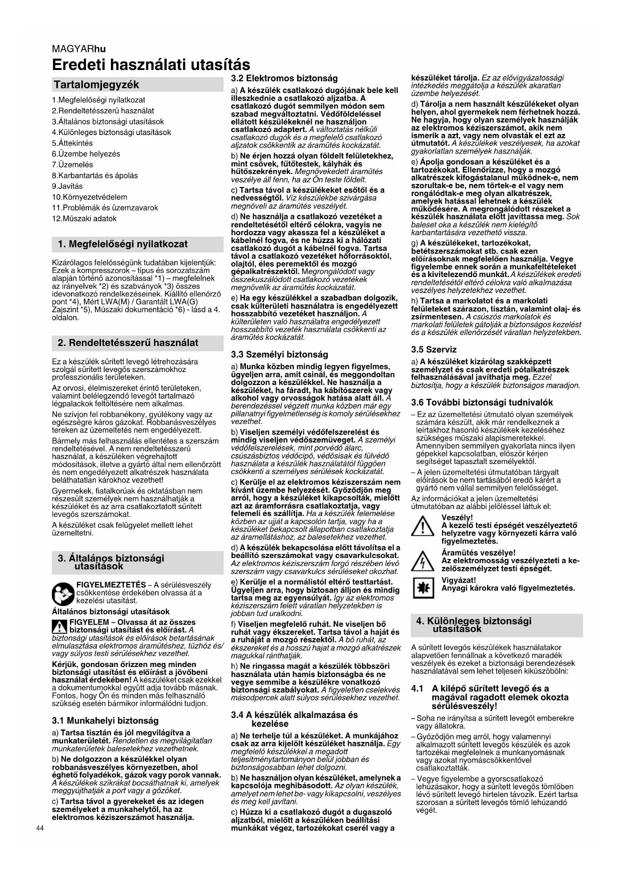Eredeti használati utasítás 1.Megfelelőségi nyilatkozat 2.Rendeltetésszerű használat 3.Általános biztonsági utasítások 4.Különleges biztonsági utasítások 5.Áttekintés 6.Üzembe helyezés 7.Üzemelés 8.Karbantartás és ápolás 9.Javítás 10.Környezetvédelem 11.Problémák és üzemzavarok 12.Műszaki adatok Kizárólagos felelősségünk tudatában kijelentjük: Ezek a kompresszorok – típus és sorozatszám alapján történő azonosítással *1) – megfelelnek az irányelvek *2) és szabványok *3) összes idevonatkozó rendelkezéseinek. Kiállító ellenőrző pont *4), Mért LWA(M) / Garantált LWA(G) Zajszint *5), Műszaki dokumentáció *6) - lásd a 4. oldalon. Ez a készülék sűrített levegő létrehozására szolgál sűrített levegős szerszámokhoz professzionális területeken. Az orvosi, élelmiszereket érintő területeken, valamint belélegzendő levegőt tartalmazó légpalackok feltöltésére nem alkalmas. Ne szívjon fel robbanékony, gyúlékony vagy az egészségre káros gázokat. Robbanásveszélyes tereken az üzemeltetés nem engedélyezett. Bármely más felhasználás ellentétes a szerszám rendeltetésével. A nem rendeltetésszerű használat, a készüléken végrehajtott módosítások, illetve a gyártó által nem ellenőrzött és nem engedélyezett alkatrészek használata beláthatatlan károkhoz vezethet! Gyermekek, fiatalkorúak és oktatásban nem részesült személyek nem használhatják a készüléket és az arra csatlakoztatott sűrített levegős szerszámokat. A készüléket csak felügyelet mellett lehet üzemeltetni. FIGYELMEZTETÉS – A sérülésveszély csökkentése érdekében olvassa át a kezelési utasítást. Általános biztonsági utasítások FIGYELEM – Olvassa át az összes biztonsági utasítást és előírást. A biztonsági utasítások és előírások betartásának elmulasztása elektromos áramütéshez, tűzhöz és/ vagy súlyos testi sérülésekhez vezethet. Kérjük, gondosan őrizzen meg minden biztonsági utasítást és el őírást a jövőbeni használat érdekében! A készüléket csak ezekkel a dokumentumokkal együtt adja tovább másnak. Fontos, hogy Ön és minden más felhasználó szükség esetén bármikor informálódni tudjon.