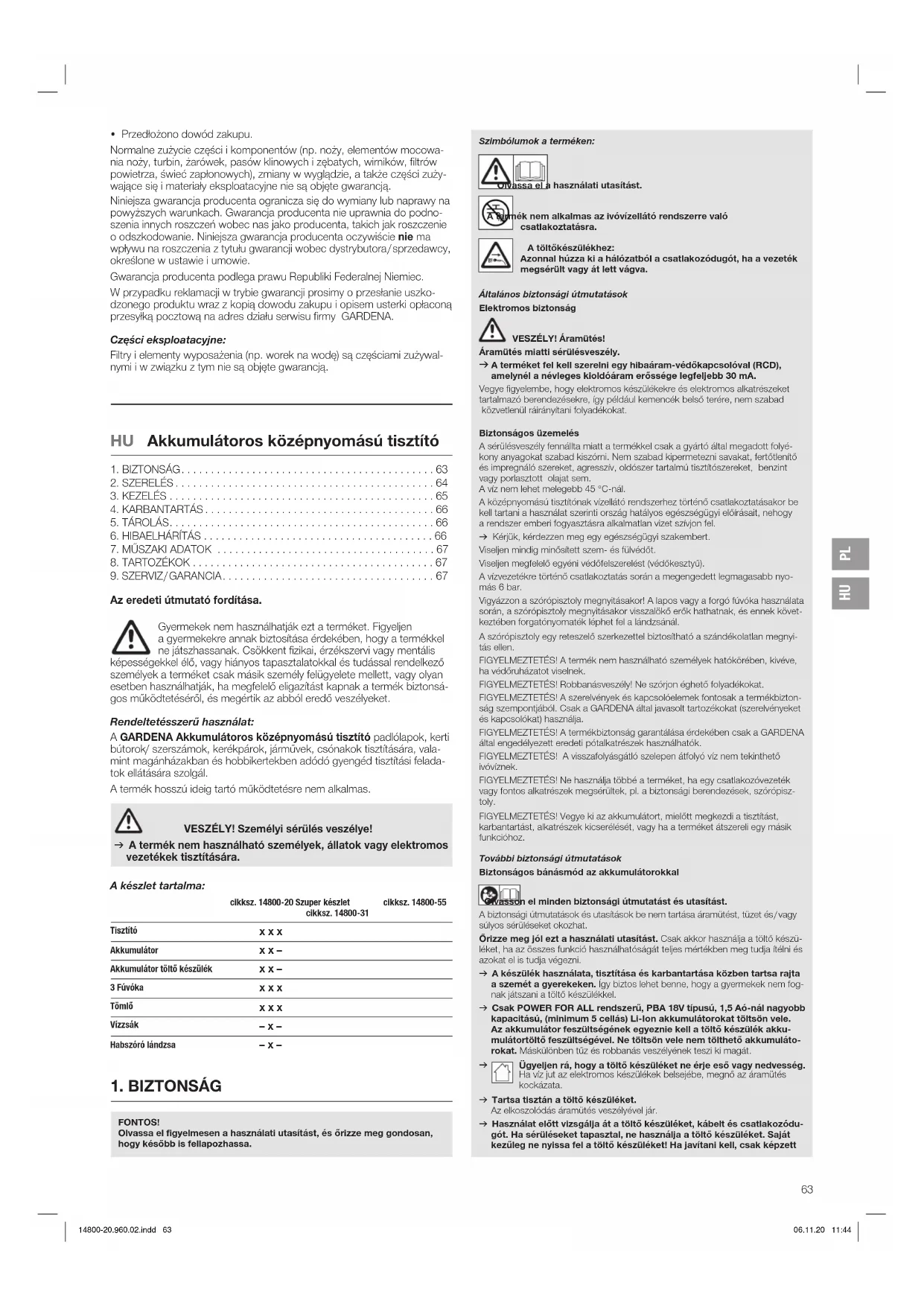 Az eredeti útmutató fordítása. Gyermekek nem használhatják ezt a terméket. Figyeljen a gyermekekre annak biztosítása érdekében, hogy a termékkel ne játszhassanak. Csökkent fizikai, érzékszervi vagy mentális képességekkel élő, vagy hiányos tapasztalatokkal és tudással rendelkező személyek a terméket csak másik személy felügyelete mellett, vagy olyan esetben használhatják, ha megfelelő eligazítást kapnak a termék biztonsá- gos működtetéséről, és megértik az abból eredő veszélyeket. Rendeltetésszerű használat: A GARDENA Akkumulátoros középnyomású tisztító padlólapok, kerti bútorok/ szerszámok, kerékpárok, járművek, csónakok tisztítására, vala- mint magánházakban és hobbikertekben adódó gyengéd tisztítási felada- tok ellátására szolgál. A termék hosszú ideig tartó működtetésre nem alkalmas. VESZÉLY! Személyi sérülés veszélye! v A termék nem használható személyek, állatok vagy elektromos vezetékek tisztítására. A készlet tartalma: cikksz. 14800-20 Szuper készlet cikksz. 14800-31 cikksz. 14800-55 Tisztító x x x Akkumulátor x x – Akkumulátor töltő készülék x x – 3 Fúvóka x x x Tömlő x x x Vízzsák – x – Habszóró lándzsa – x – Szimbólumok a terméken: Olvassa el a használati utasítást. A termék nem alkalmas az ivóvízellátó rendszerre való csatlakoztatásra. A töltőkészülékhez: Azonnal húzza ki a hálózatból a csatlakozódugót, ha a vezeték megsérült vagy át lett vágva. Általános biztonsági útmutatások Elektromos biztonság VESZÉLY! Áramütés! Áramütés miatti sérülésveszély. v A terméket fel kell szerelni egy hibaáram-védőkapcsolóval (RCD), amelynél a névleges kioldóáram erőssége legfeljebb 30 mA. Vegye figyelembe, hogy elektromos készülékekre és elektromos alkatrészeket tartalmazó berendezésekre, így például kemencék belső terére, nem szabad közvetlenül ráirányítani folyadékokat. Biztonságos üzemelés A sérülésveszély fennállta miatt a termékkel csak a gyártó által megadott folyé- kony anyagokat szabad kiszórni. Nem szabad kipermetezni savakat, fertőtlenítő és impregnáló szereket, agresszív, oldószer tartalmú tisztítószereket, benzint vagy porlasztott olajat sem. A víz nem lehet melegebb 45 °C-nál. A középnyomású tisztítónak vízellátó rendszerhez történő csatlakoztatásakor be kell tartani a használat szerinti ország hatályos egészségügyi előírásait, nehogy a rendszer emberi fogyasztásra alkalmatlan vizet szívjon fel. v Kérjük, kérdezzen meg egy egészségügyi szakembert. Viseljen mindig minősített szem- és fülvédőt. Viseljen megfelelő egyéni védőfelszerelést (védőkesztyű). A vízvezetékre történő csatlakoztatás során a megengedett legmagasabb nyo- más 6 bar. Vigyázzon a szórópisztoly megnyitásakor! A lapos vagy a forgó fúvóka használata során, a szórópisztoly megnyitásakor visszalökő erők hathatnak, és ennek követ- keztében forgatónyomaték léphet fel a lándzsánál. A szórópisztoly egy reteszelő szerkezettel biztosítható a szándékolatlan megnyi- tás ellen. FIGYELMEZTETÉS! A termék nem használható személyek hatókörében, kivéve, ha védőruházatot viselnek. FIGYELMEZTETÉS! Robbanásveszély! Ne szórjon éghető folyadékokat. FIGYELMEZTETÉS! A szerelvények és kapcsolóelemek fontosak a termékbizton- ság szempontjából. Csak a GARDENA által javasolt tartozékokat (szerelvényeket és kapcsolókat) használja. FIGYELMEZTETÉS! A termékbiztonság garantálása érdekében csak a GARDENA által engedélyezett eredeti pótalkatrészek használhatók. FIGYELMEZTETÉS! A visszafolyásgátló szelepen átfolyó víz nem tekinthető ivóvíznek. FIGYELMEZTETÉS! Ne használja többé a terméket, ha egy csatlakozóvezeték vagy fontos alkatrészek megsérültek, pl. a biztonsági berendezések, szórópisz- toly. FIGYELMEZTETÉS! Vegye ki az akkumulátort, mielőtt megkezdi a tisztítást, karbantartást, alkatrészek kicserélését, vagy ha a terméket átszereli egy másik funkcióhoz. További biztonsági útmutatások Biztonságos bánásmód az akkumulátorokkal Olvasson el minden biztonsági útmutatást és utasítást. A biztonsági útmutatások és utasítások be nem tartása áramütést, tüzet és / vagy súlyos sérüléseket okozhat. Őrizze meg jól ezt a használati utasítást. Csak akkor használja a töltő készü- léket, ha az összes funkció használhatóságát teljes mértékben meg tudja ítélni és azokat el is tudja végezni. v A készülék használata, tisztítása és karbantartása közben tartsa rajta a szemét a gyerekeken. Így biztos lehet benne, hogy a gyermekek nem fog- nak játszani a töltő készülékkel. v Csak POWER FOR ALL rendszerű, PBA 18V típusú, 1,5 Aó-nál nagyobb kapacitású, (minimum 5 cellás) Li-Ion akkumulátorokat töltsön vele. Az akkumulátor feszültségének egyeznie kell a töltő készülék akku- mulátortöltő feszültségével. Ne töltsön vele nem tölthető akkumuláto- rokat. Máskülönben tűz és robbanás veszélyének teszi ki magát.