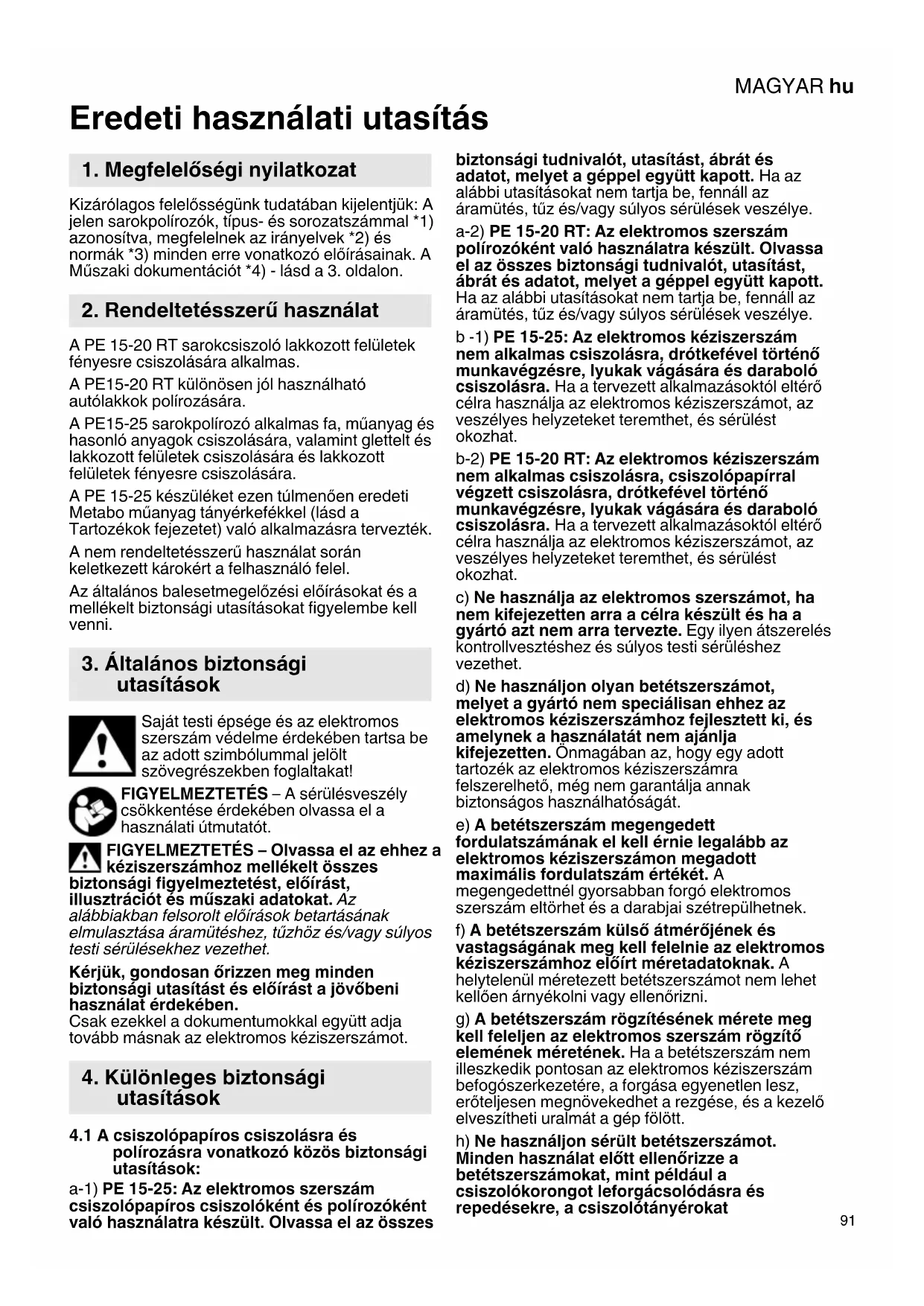 Eredeti használati utasítás Kizárólagos felelősségünk tudatában kijelentjük: A jelen sarokpolírozók, típus- és sorozatszámmal *1) azonosítva, megfelelnek az irányelvek *2) és normák *3) minden erre vonatkozó előírásainak. A Műszaki dokumentációt *4) - lásd a 3. oldalon. A PE 15-20 RT sarokcsiszoló lakkozott felületek fényesre csiszolására alkalmas. A PE15-20 RT különösen jól használható autólakkok polírozására. A PE15-25 sarokpolírozó alkalmas fa, műanyag és hasonló anyagok csiszolására, valamint glettelt és lakkozott felületek csiszolására és lakkozott felületek fényesre csiszolására. A PE 15-25 készüléket ezen túlmenően eredeti Metabo műanyag tányérkefékkel (lásd a Tartozékok fejezetet) való alkalmazásra tervezték. A nem rendeltetésszerű használat során keletkezett károkért a felhasználó felel. Az általános balesetmegelőzési előírásokat és a mellékelt biztonsági utasításokat figyelembe kell venni. Saját testi épsége és az elektromos szerszám védelme érdekében tartsa be az adott szimbólummal jelölt szövegrészekben foglaltakat! FIGYELMEZTETÉS – A sérülésveszély csökkentése érdekében olvassa el a használati útmutatót. FIGYELMEZTETÉS – Olvassa el az ehhez a kéziszerszámhoz mellékelt összes biztonsági figyelmeztetést, előírást, illusztrációt és műszaki adatokat. Az alábbiakban felsorolt előírások betartásának elmulasztása áramütéshez, tűzhöz és/vagy súlyos testi sérülésekhez vezethet. Kérjük, gondosan őrizzen meg minden biztonsági utasítást és előírást a jövőbeni használat érdekében. Csak ezekkel a dokumentumokkal együtt adja tovább másnak az elektromos kéziszerszámot.
