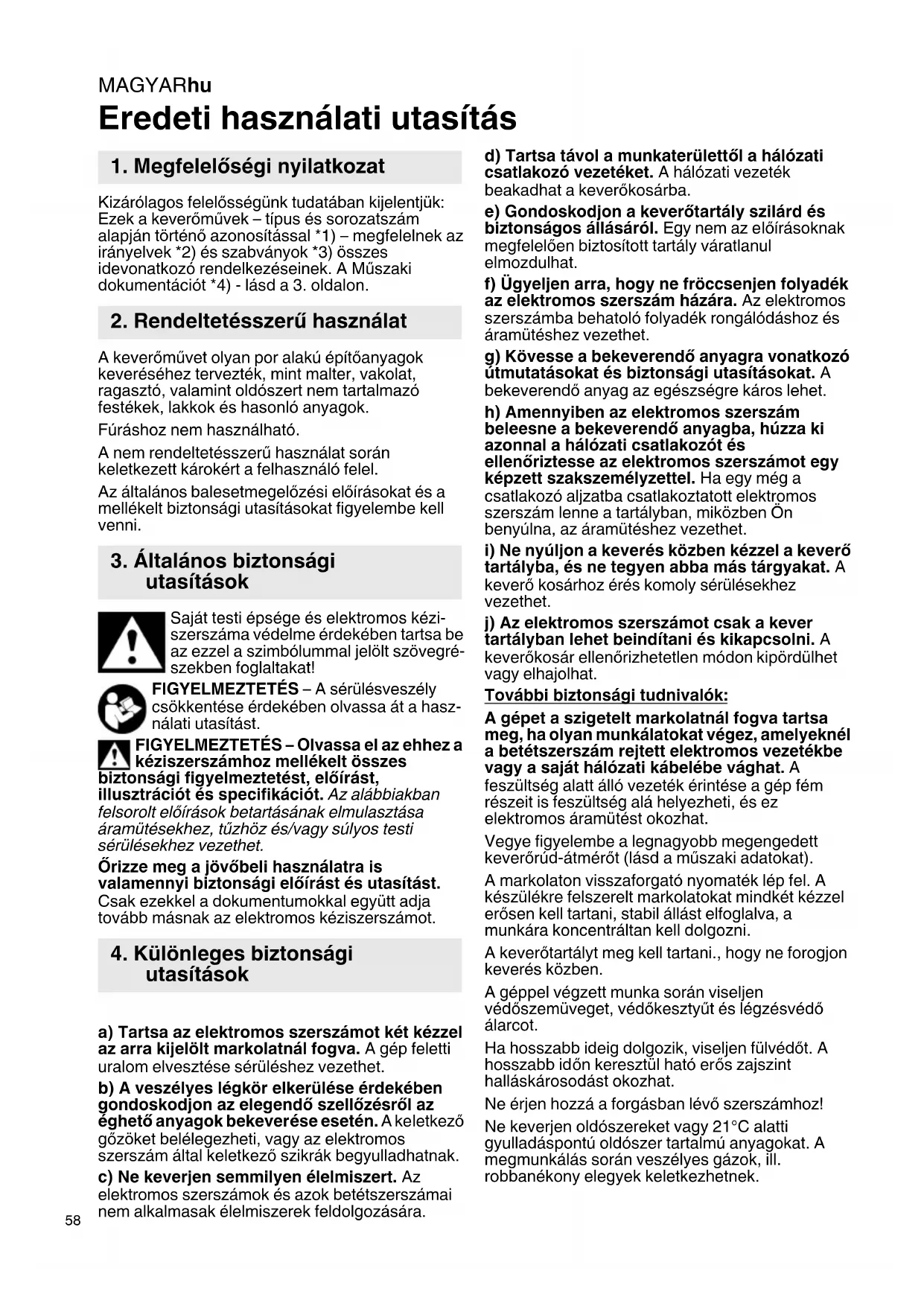 Eredeti használati utasítás Kizárólagos felelősségünk tudatában kijelentjük: Ezek a keverőművek – típus és sorozatszám alapján történő azonosítással *1) – megfelelnek az irányelvek *2) és szabványok *3) összes idevonatkozó rendelkezéseinek. A Műszaki dokumentációt *4) - lásd a 3. oldalon. A keverőművet olyan por alakú építőanyagok keveréséhez tervezték, mint malter, vakolat, ragasztó, valamint oldószert nem tartalmazó festékek, lakkok és hasonló anyagok. Fúráshoz nem használható. A nem rendeltetésszerű használat során keletkezett károkért a felhasználó felel. Az általános balesetmegelőzési előírásokat és a mellékelt biztonsági utasításokat figyelembe kell venni. Saját testi épsége és elektromos kézi- szerszáma védelme érdekében tartsa be az ezzel a szimbólummal jelölt szövegré- szekben foglaltakat! FIGYELMEZTETÉS – A sérülésveszély csökkentése érdekében olvassa át a hasz- nálati utasítást. FIGYELMEZTETÉS – Olvassa el az ehhez a kéziszerszámhoz mellékelt összes biztonsági figyelmeztetést, előírást, illusztrációt és specifikációt. Az alábbiakban felsorolt előírások betartásának elmulasztása áramütésekhez, tűzhöz és/vagy súlyos testi sérülésekhez vezethet. Őrizze meg a jövőbeli használatra is valamennyi biztonsági előírást és utasítást. Csak ezekkel a dokumentumokkal együtt adja tovább másnak az elektromos kéziszerszámot. a) Tartsa az elektromos szerszámot két kézzel az arra kijelölt markolatnál fogva. A gép feletti uralom elvesztése sérüléshez vezethet. b) A veszélyes légkör elkerülése érdekében gondoskodjon az elegendő szellőzésről az éghető anyagok bekeverése esetén. A keletkező gőzöket belélegezheti, vagy az elektromos szerszám által keletkező szikrák begyulladhatnak. c) Ne keverjen semmilyen élelmiszert. Az elektromos szerszámok és azok betétszerszámai nem alkalmasak élelmiszerek feldolgozására. d) Tartsa távol a munkaterülett ől a hálózati csatlakozó vezetéket. A hálózati vezeték beakadhat a keverőkosárba. e) Gondoskodjon a keverőtartály szilárd és biztonságos állásáról. Egy nem az előírásoknak megfelelően biztosított tartály váratlanul elmozdulhat. f) Ügyeljen arra, hogy ne fröccsenjen folyadék az elektromos szerszám házára. Az elektromos szerszámba behatoló folyadék rongálódáshoz és áramütéshez vezethet. g) Kövesse a bekeverendő anyagra vonatkozó útmutatásokat és biztonsági utasításokat. A bekeverendő anyag az egészségre káros lehet. h) Amennyiben az elektromos szerszám beleesne a bekeverendő anyagba, húzza ki azonnal a hálózati csatlakozót és ellenőriztesse az elektromos szerszámot egy képzett szakszemélyzettel. Ha egy még a csatlakozó aljzatba csatlakoztatott elektromos szerszám lenne a tartályban, miközben Ön benyúlna, az áramütéshez vezethet.