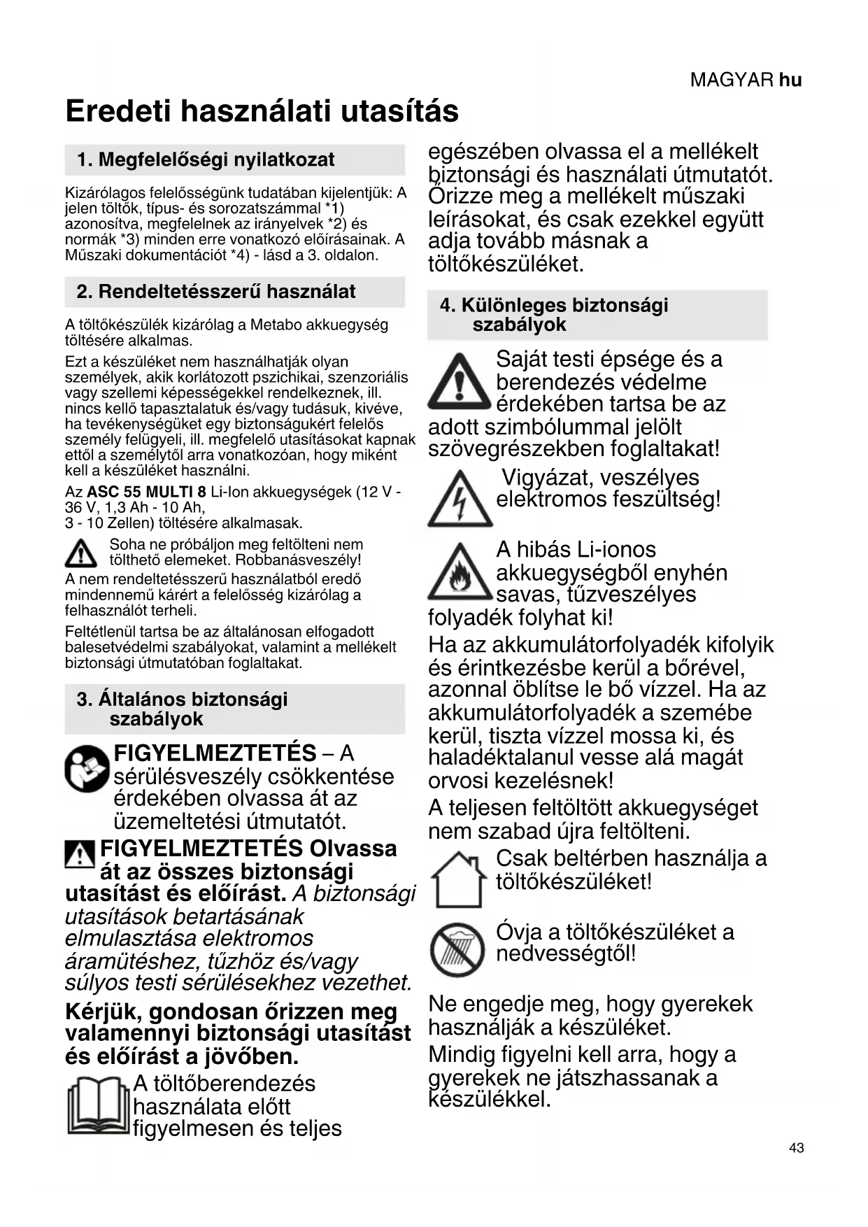Eredeti használati utasítás Kizárólagos felelősségünk tudatában kijelentjük: A jelen töltők, típus- és sorozatszámmal *1) azonosítva, megfelelnek az irányelvek *2) és normák *3) minden erre vonatkozó előírásainak. A Műszaki dokumentációt *4) - lásd a 3. oldalon. A töltőkészülék kizárólag a Metabo akkuegység töltésére alkalmas. Ezt a készüléket nem használhatják olyan személyek, akik korlátozott pszichikai, szenzoriális vagy szellemi képességekkel rendelkeznek, ill. nincs kellő tapasztalatuk és/vagy tudásuk, kivéve, ha tevékenységüket egy biztonságukért felelős személy felügyeli, ill. megfelelő utasításokat kapnak ettől a személytől arra vonatkozóan, hogy miként kell a készüléket használni. Az ASC 55 MULTI 8 Li-Ion akkuegységek (12 V - 36 V, 1,3 Ah - 10 Ah,