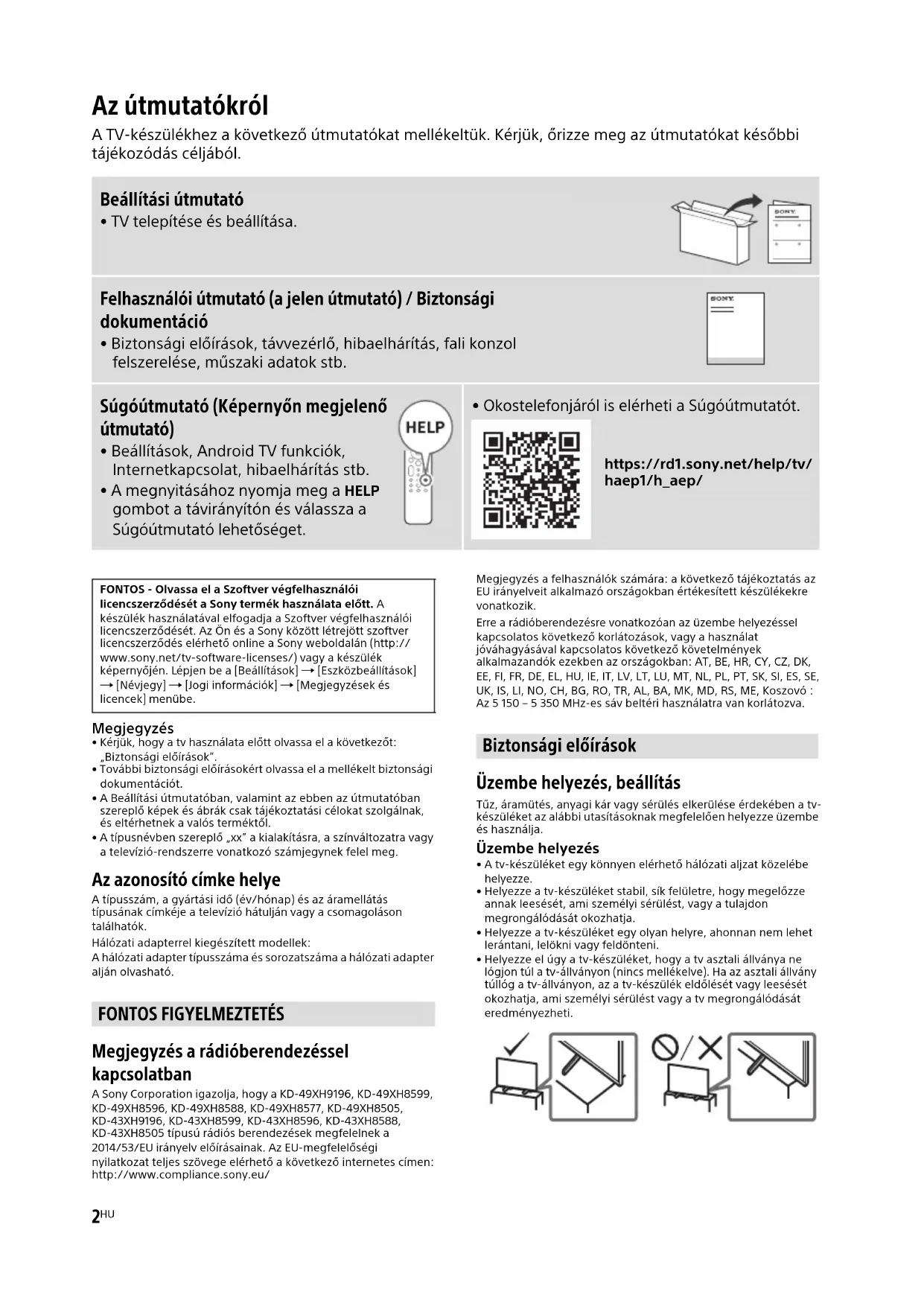 - A típusnévben szereplő „xx” a kialakításra, a színváltozatra vagy a televízió-rendszerre vonatkozó számjegynek felel meg. Az azonosító címke helye A típusszám, a gyártási idő (év/hónap) és az áramellátás típusának címkéje a televízió hátulján vagy a csomagoláson találhatók. Hálózati adapterrel kiegészített modellek: A hálózati adapter típusszáma és sorozatszáma a hálózati adapter alján olvasható. Megjegyzés a rádióberendezéssel kapcsolatban A Sony Corporation igazolja, hogy a KD-49XH9196, KD-49XH8599, KD-49XH8596, KD-49XH8588, KD-49XH8577, KD-49XH8505, KD-43XH9196, KD-43XH8599, KD-43XH8596, KD-43XH8588, KD-43XH8505 típusú rádiós berendezések megfelelnek a 2014/53/EU irányelv előírásainak. Az EU-megfelelőségi nyilatkozat teljes szövege elérhető a következő internetes címen: http://www.compliance.sony.eu/ Megjegyzés a felhasználók számára: a következő tájékoztatás az EU irányelveit alkalmazó országokban értékesített készülékekre vonatkozik. Erre a rádióberendezésre vonatkozóan az üzembe helyezéssel kapcsolatos következő korlátozások, vagy a használat jóváhagyásával kapcsolatos következő követelmények alkalmazandók ezekben az országokban: AT, BE, HR, CY, CZ, DK, EE, FI, FR, DE, EL, HU, IE, IT, LV, LT, LU, MT, NL, PL, PT, SK, SI, ES, SE, UK, IS, LI, NO, CH, BG, RO, TR, AL, BA, MK, MD, RS, ME, Koszovó : Az 5 150 – 5 350 MHz-es sáv beltéri használatra van korlátozva. Üzembe helyezés, beállítás Tűz, áramütés, anyagi kár vagy sérülés elkerülése érdekében a tv- készüléket az alábbi utasításoknak megfelelően helyezze üzembe és használja. Üzembe helyezés
