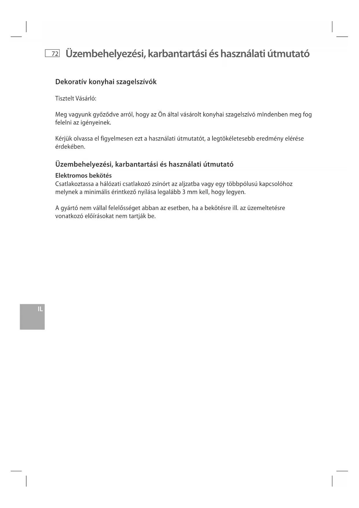 Üzembehelyezési, karbantartási és használati útmutató Dekoratív konyhai szagelszívók Tisztelt Vásárló: Meg vagyunk győződve arról, hogy az Ön által vásárolt konyhai szagelszívó mIndenben meg fog felelni az igényeinek. Kérjük olvassa el figyelmesen ezt a használati útmutatót, a legtökéletesebb eredmény elérése érdekében. Üzembehelyezési, karbantartási és használati útmutató Elektromos bekötés Csatlakoztassa a hálózati csatlakozó zsinórt az aljzatba vagy egy többpólusú kapcsolóhoz melynek a minimális érintkező nyílása legalább 3 mm kell, hogy legyen. A gyártó nem vállal felelősséget abban az esetben, ha a bekötésre ill. az üzemeltetésre vonatkozó előírásokat nem tartják be.73