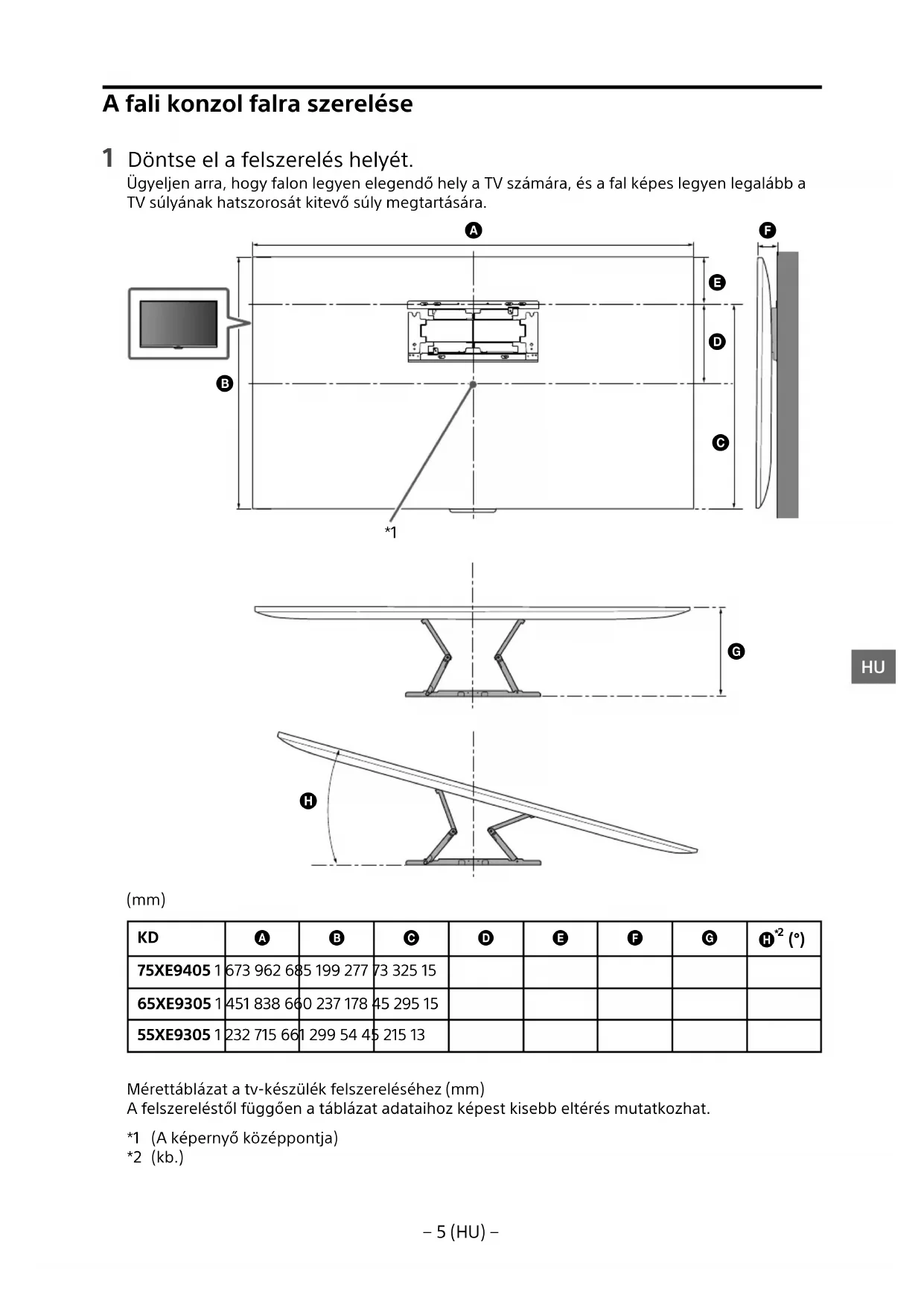 75XE9405 1 673 962 685 199 277 73 325 15 65XE9305 1 451 838 660 237 178 45 295 15 55XE9305 1 232 715 661 299 54 45 215 13 Mérettáblázat a tv-készülék felszereléséhez (mm) A felszereléstől függően a táblázat adataihoz képest kisebb eltérés mutatkozhat. *1 (A képernyő középpontja) *2 (kb.)− 6 (HU) − Megjegyzés