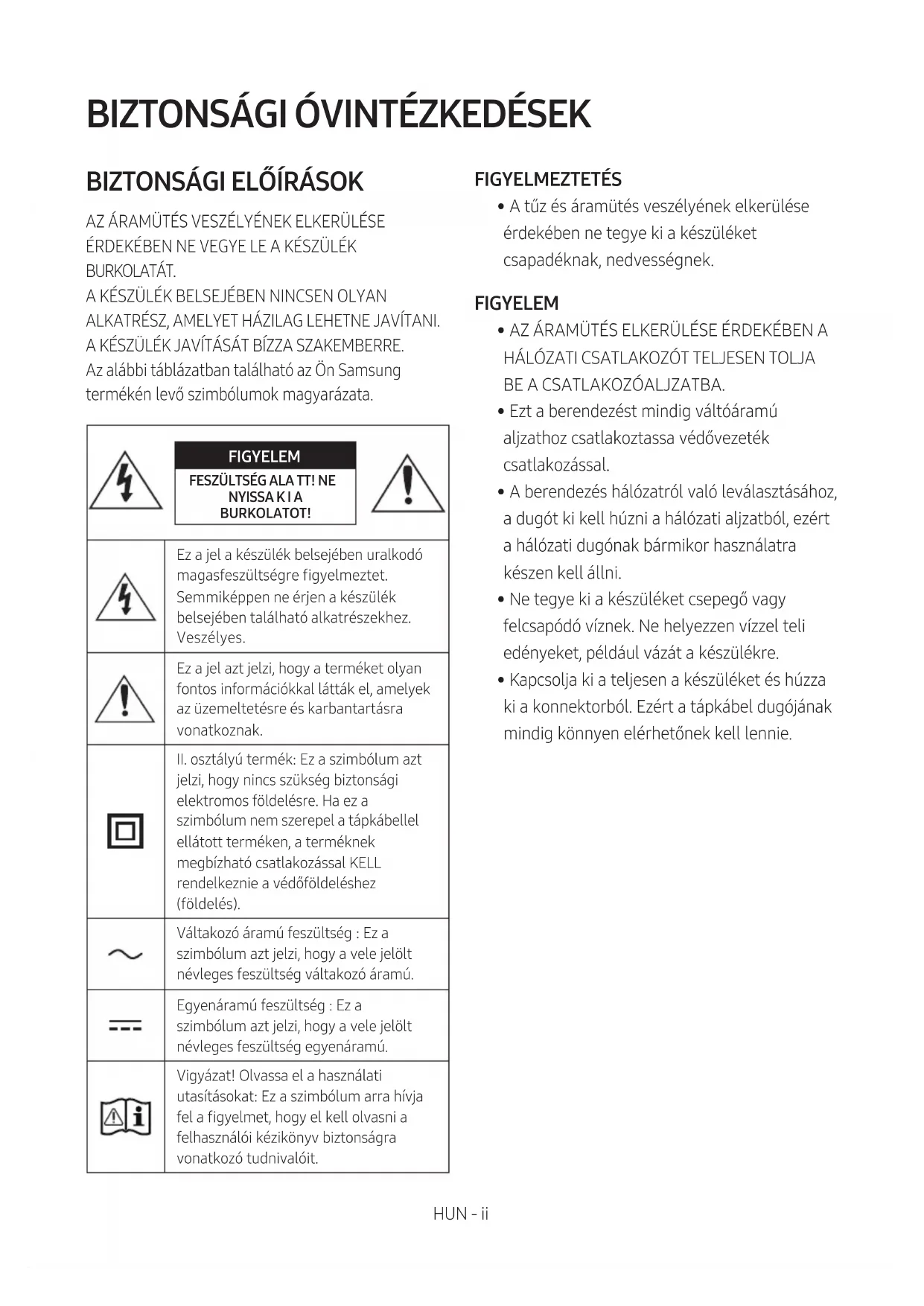AZ ÁRAMÜTÉS VESZÉLYÉNEK ELKERÜLÉSE ÉRDEKÉBEN NE VEGYE LE A KÉSZÜLÉK BURKOLATÁT. A KÉSZÜLÉK BELSEJÉBEN NINCSEN OLYAN ALKATRÉSZ, AMELYET HÁZILAG LEHETNE JAVÍTANI. A KÉSZÜLÉK JAVÍTÁSÁT BÍZZA SZAKEMBERRE. Az alábbi táblázatban található az Ön Samsung termékén levő szimbólumok magyarázata. FIGYELEM FESZÜLTSÉG ALA TT! NE NYISSA K I A BURKOLATOT!Ez a jel a készülék belsejében uralkodó magasfeszültségre gyelmeztet. Semmiképpen ne érjen a készülék belsejében található alkatrészekhez. Veszélyes.Ez a jel azt jelzi, hogy a terméket olyan fontos információkkal látták el, amelyek az üzemeltetésre és karbantartásra vonatkoznak.II. osztályú termék: Ez a szimbólum azt jelzi, hogy nincs szükség biztonsági elektromos földelésre. Ha ez a szimbólum nem szerepel a tápkábellel ellátott terméken, a terméknek megbízható csatlakozással KELL rendelkeznie a védőföldeléshez (földelés). Váltakozó áramú feszültség : Ez a szimbólum azt jelzi, hogy a vele jelölt névleges feszültség váltakozó áramú.Egyenáramú feszültség : Ez a szimbólum azt jelzi, hogy a vele jelölt névleges feszültség egyenáramú.Vigyázat! Olvassa el a használati utasításokat: Ez a szimbólum arra hívja fel a gyelmet, hogy el kell olvasni a felhasználói kézikönyv biztonságra vonatkozó tudnivalóit. FIGYELMEZTETÉS