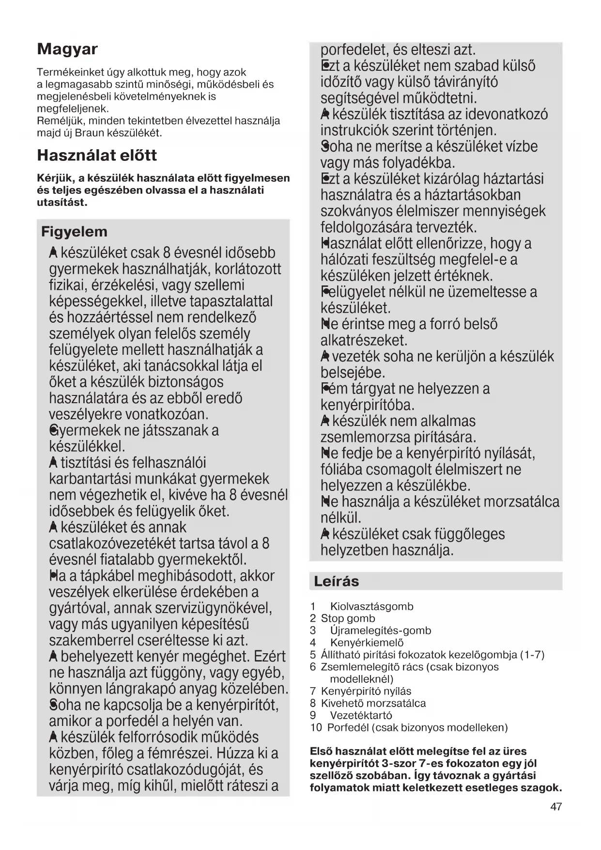 - Időnként húzza ki és ürítse a morzsatálcát (8). 48A gyártó az esetleges változtatások jogát fenntartja. A környezetszennyezés elkerülése érdekében arra kérjük, hogy a készülék hasznos élettartalma végén ne dobja azt a háztartási szemétbe. A mıködésképtelen készüléket leadhatja a Braun szervizközpontban, vagy az országa szabályainak megfelelOE módon dobja a hulladékgyıjtOEbe. Az élelmiszerekkel kapcsolatba kerülő tárgyak és anyagok megfelelnek az Európai Unió 1935/2004 rendeletében foglaltaknak. Hibaelhárítási útmutató Probléma Ok Megoldás A kenyér majdnem azonnal felpattan pirítatlanul A morzsatálca helyzete nem megfelelő A kenyérkiemelő nincs megfelelő helyzetben Ellenőrizze, hogy a morzsatálca helyzete megfelelő-e Ellenőrizze, hogy a kenyérkiemelő helyzete megfelelő-e Ha egyik sem hozott megoldást, vegye fel a kapcsolatot a Braun ügyfélszolgálattal A kenyér túl sötétre vagy túl világosra pirult A választott pirítási fokozat túl magas vagy túl alacsony Válasszon alacsonyabb/magasabb pirítási fokozatot Füst jön ki a kenyérpirítóból A választott pirítási fokozat túl magas a pirítandó kenyér típusához Nyomja meg a STOP gombot a pirítási ciklus leállításához Válasszon alacsonyabb pirítási fokozatot 49Hrvatski Naši proizvodi izrađeni su u skladu s najvišim standardima kvalitete, funkcionalnosti i dizajna. Nadamo se da ćete u potpunosti uživati u svom novom uređaju tvrtke Braun. Prije uporabe Molimo vas da prije uporabe uređaja pažljivo i u cijelosti pročitajte upute. Pozor