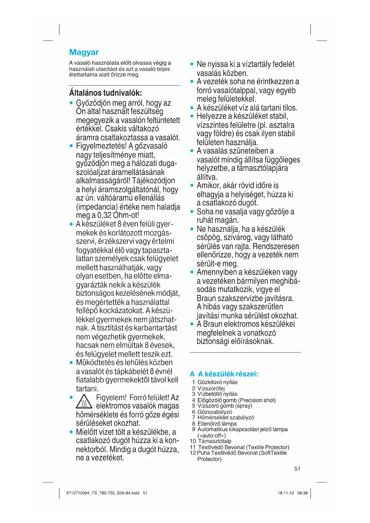 A Braun elektromos készülékei megfelelnek a vonatkozó biztonsági elŒírásoknak. A A készülék részei: 1 GŒzkifúvó nyílás 2 Vízszórófej 3 VízbetöltŒ nyílás 4 ElŒgözölŒ gomb (Precision shot) 5 Vízszóró gomb (spray) 6 GŒzszabályzó 7 HŒmérséklet szabályzó 8 EllenŒrzŒ lámpa 9 Automatikus kikapcsolást jelzŒ lámpa («auto-off») 10 Támasztótalp 11 TextilvédŒ Bevonat (Textile Protector) 12 Puha TextilvédŒ Bevonat (SoftTextile Protector) Magyar 5712710094_TS_780-755_S06-84.indd 515712710094_TS_780-755_S06-84.indd 51 18.11.13 08:3818.11.13 08:3852 B Bekapcsolás elŒtt Ez a vasaló csapvízzel mıködik. Amennyiben Önnél nagyon kemény a víz, csapvíz és desztillált víz fele-fele arányú keverékének használatát javasoljuk. A «max» jelzésig töltse fel a tartályt. Soha ne használjon csak desztillált vizet. Ne adjon a vízhez semmilyen adalék anyagot (pl. keményítŒt). Ne használja a centrifugából elfolyó vizet.