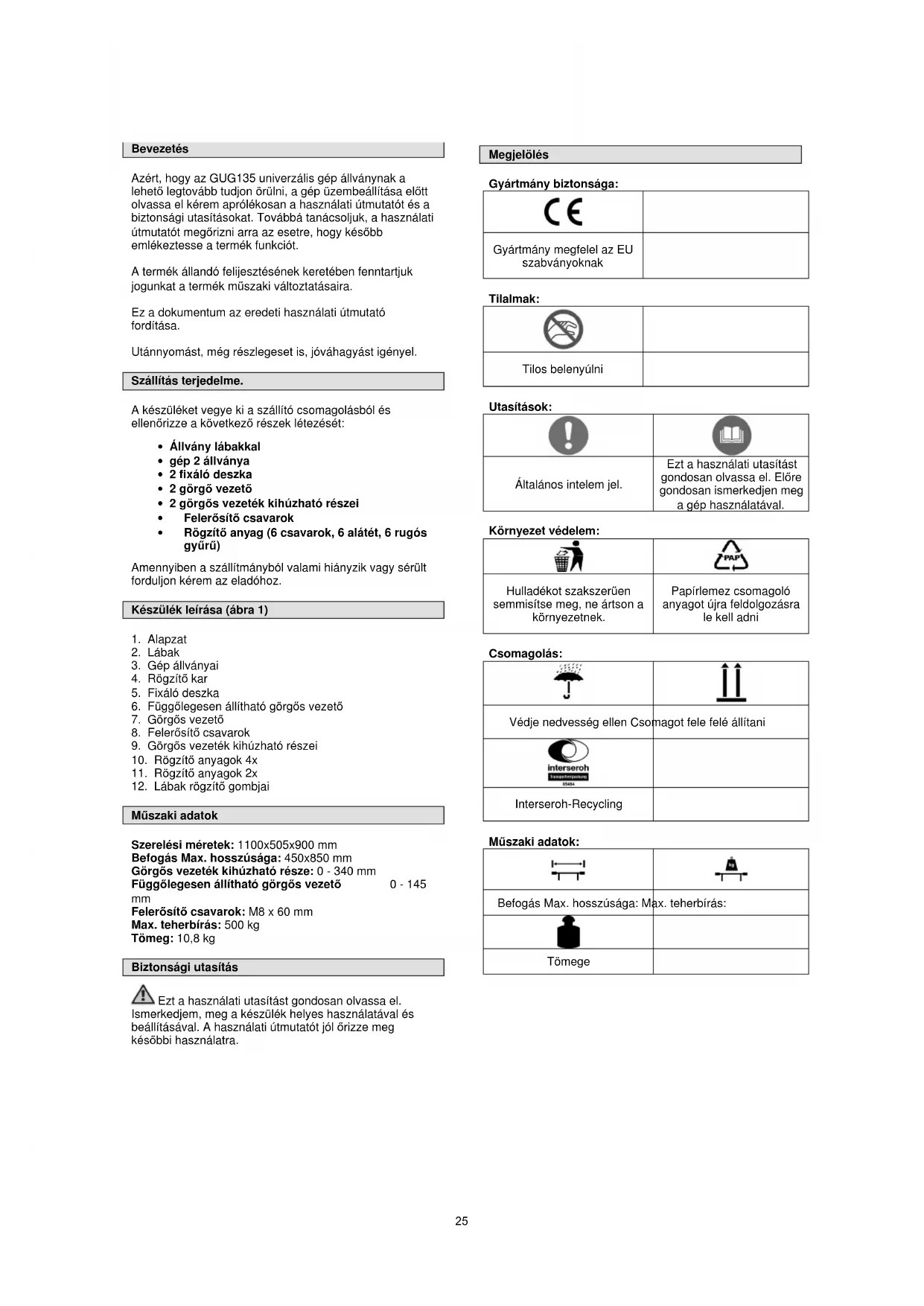 Felerısítı csavarok: M8 x 60 mm Max. teherbírás: 500 kg Tömeg: 10,8 kg Biztonsági utasítás Ezt a használati utasítást gondosan olvassa el. Ismerkedjem, meg a készülék helyes használatával és beállításával. A használati útmutatót jól ırizze meg késıbbi használatra. Megjelölés Gyártmány biztonsága: Gyártmány megfelel az EU szabványoknak Tilalmak: Tilos belenyúlni Utasítások: Általános intelem jel. Ezt a használati utasítást gondosan olvassa el. Elıre gondosan ismerkedjen meg a gép használatával. Környezet védelem: Hulladékot szakszerően semmisítse meg, ne ártson a környezetnek. Papírlemez csomagoló anyagot újra feldolgozásra le kell adni Csomagolás: Védje nedvesség ellen Csomagot fele felé állítani Interseroh-Recycling Mőszaki adatok: Befogás Max. hosszúsága: Max. teherbírás: Tömege 25Tréning: Gondosan olvassa el a használati útmutatót. Alaposan ismerkedjen meg a berendezés kezelésével és rendes használatával. Tudnia kell, miképpen dolgozik a készülék, hogyan kell gyorsan kikapcsolni a kezelı berendezés. Sose engedje a gyerekeket dolgozni a géppel. Sose engedje felnıtteket sem a géppel dolgozni rendes kiképzés nélkül. A munkahelyére ne engedjen idegen személyeket, fıleg kis gyermekeket és házi állatot. Legyen óvatos akadályozza meg megcsúszást vagy esést. Rendeltetés szerinti használat! Univerzális állvány kizárólag elektromos készülékek/gépek befogására szolgál, amelyeket biztonságosan és megbízhatóan hozzá lehet erısíteni a gép állványához. Az üzembiztos felerısítésért a felhasználó felelıs. Ezzel a géppel nem lehet más munkát végezni mint amire készült vagy amit nem tartalmaz a használati útmutató. Minden más használatot a gép rendeltetés elleni használatnak van tekintve. A következett károkért a gyártó nem felel. Vegye figyelembe, hogy ez a gép nem készült ipari használatra. Szerelés Szerelés az állványra (ábra 2-4)