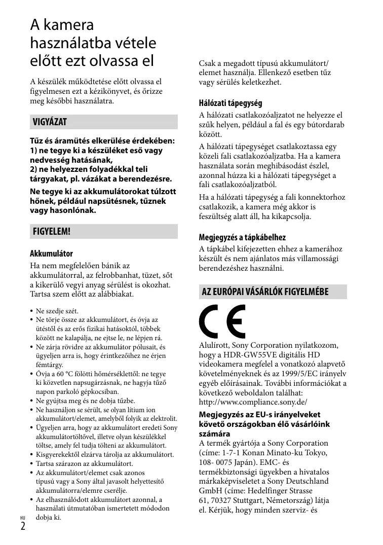 Ne szedje szét. Ne törje össze az akkumulátort, és óvja az ütéstől és az erős fizikai hatásoktól, többek között ne kalapálja, ne ejtse le, ne lépjen rá. Ne zárja rövidre az akkumulátor pólusait, és ügyeljen arra is, hogy érintkezőihez ne érjen fémtárgy. Óvja a 60 °C fölötti hőmérséklettől: ne tegye ki közvetlen napsugárzásnak, ne hagyja tűző napon parkoló gépkocsiban. Ne gyújtsa meg és ne dobja tűzbe. Ne használjon se sérült, se olyan lítium ion akkumulátort/elemet, amelyből folyik az elektrolit. Ügyeljen arra, hogy az akkumulátort eredeti Sony akkumulátortöltővel, illetve olyan készülékkel töltse, amely fel tudja tölteni az akkumulátort. Kisgyerekektől elzárva tárolja az akkumulátort. Tartsa szárazon az akkumulátort. Az akkumulátort/elemet csak azonos típusú vagy a Sony által javasolt helyettesítő akkumulátorra/elemre cserélje. Az elhasználódott akkumulátort azonnal, a használati útmutatóban ismertetett módodon dobja ki. Csak a megadott típusú akkumulátort/ elemet használja. Ellenkező esetben tűz vagy sérülés keletkezhet. Hálózati tápegység A hálózati csatlakozóaljzatot ne helyezze el szűk helyen, például a fal és egy bútordarab között. A hálózati tápegységet csatlakoztassa egy közeli fali csatlakozóaljzatba. Ha a kamera használata során meghibásodást észlel, azonnal húzza ki a hálózati tápegységet a fali csatlakozóaljzatból. Ha a hálózati tápegység a fali konnektorhoz csatlakozik, a kamera még akkor is feszültség alatt áll, ha kikapcsolja. Megjegyzés a tápkábelhez A tápkábel kifejezetten ehhez a kamerához készült és nem ajánlatos más villamossági berendezéshez használni. AZ EURÓPAI VÁSÁRLÓK FIGYELMÉBE Alulírott, Sony Corporation nyilatkozom, hogy a HDR-GW55VE digitális HD videokamera megfelel a vonatkozó alapvető követelményeknek és az 1999/5/EC irányelv egyéb előírásainak. További információkat a következő weboldalon találhat: http://www.compliance.sony.de/ Megjegyzés az EU-s irányelveket követő országokban élő vásárlóink számára A termék gyártója a Sony Corporation (címe: 1-7-1 Konan Minato-ku Tokyo,
