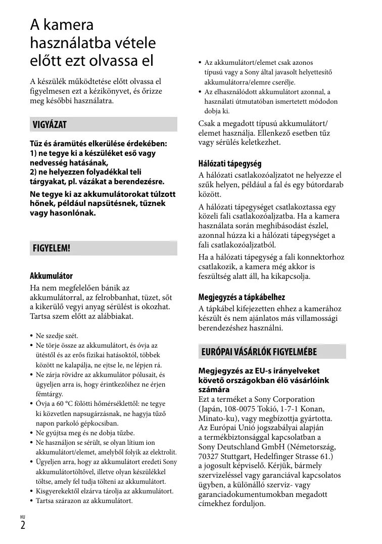 Az akkumulátort/elemet csak azonos típusú vagy a Sony által javasolt helyettesítő akkumulátorra/elemre cserélje. Az elhasználódott akkumulátort azonnal, a használati útmutatóban ismertetett módodon dobja ki. Csak a megadott típusú akkumulátort/ elemet használja. Ellenkező esetben tűz vagy sérülés keletkezhet. Hálózati tápegység A hálózati csatlakozóaljzatot ne helyezze el szűk helyen, például a fal és egy bútordarab között. A hálózati tápegységet csatlakoztassa egy közeli fali csatlakozóaljzatba. Ha a kamera használata során meghibásodást észlel, azonnal húzza ki a hálózati tápegységet a fali csatlakozóaljzatból. Ha a hálózati tápegység a fali konnektorhoz csatlakozik, a kamera még akkor is feszültség alatt áll, ha kikapcsolja. Megjegyzés a tápkábelhez A tápkábel kifejezetten ehhez a kamerához készült és nem ajánlatos más villamossági berendezéshez használni. EURÓPAI VÁSÁRLÓK FIGYELMÉBE Megjegyzés az EU-s irányelveket követő országokban élö vásárlóink számára Ezt a terméket a Sony Corporation (Japán, 108-0075 Tokió, 1-7-1 Konan, Minato-ku), vagy megbízottja gyártotta. Az Európai Unió jogszabályai alapján a termékbiztonsággal kapcsolatban a Sony Deutschland GmbH (Németország, 70327 Stuttgart, Hedelfinger Strasse 61.) a jogosult képviselő. Kérjük, bármely szervizeléssel vagy garanciával kapcsolatos ügyben, a különálló szerviz- vagy garanciadokumentumokban megadott címekhez forduljon. Ezt a terméket bevizsgálták, és úgy találták, hogy az EMC előírásokban meghatározott korlátokon belül esik, ha 3 méternél rövidebb átjátszókábellel használják. Figyelem Bizonyos frekvenciájú elektromágneses mezők e készülék kép- és hangminőségét befolyásolhatják. Megjegyzés Ha sztatikus elektromosság vagy elektromágneses erőtér miatt az adatátvitel megszakad, indítsa újra az alkalmazást, vagy húzza ki, majd csatlakoztassa ismét az adatátviteli (USB stb.) kábelt. Feleslegessé vált elektromos és elektronikus készülékek hulladékként való eltávolítása (Használható az Európai Unió és egyéb európai országok szelektív hulladékgyűjtési rendszereiben) Ez a szimbólum a készüléken vagy a csomagolásán azt jelzi, hogy a terméket ne kezelje háztartási hulladékként. Kérjük, hogy az elektromos és elektronikai hulladék gyűjtésére kijelölt gyűjtőhelyen adja le. A feleslegessé vált termék helyes kezelésével segít megelőzni a környezet és az emberi egészség károsodását, mely bekövetkezhetne, ha nem követi a hulladékkezelés helyes módját. Az anyagok újrahasznosítása segít a természeti erőforrások megőrzésében. A termék újrahasznosítása érdekében további információért forduljon a lakhelyén az illetékesekhez, a helyi hulladékgyűjtő szolgáltatóhoz vagy ahhoz az üzlethez, ahol a terméket megvásárolta. Feleslegessé vált elemek hulladékként való eltávolítása (Használható az Európai Unió és egyéb európai országok szelektív hulladékgyűjtési rendszereiben) Ez a szimbólum az elemen vagy annak csomagolásán azt jelzi, hogy a terméket ne kezelje háztartási hulladékként. Egyes elemeken vagy azok csomagolásán ez a szimbólum együtt szerepelhet a higany (Hg) vagy az ólom (Pb) vegyjelével akkor, ha az elem 0,0005%-nál több higanyt vagy 0,004%-nál több ólmot tartalmaz. Kérjük, hogy azt a használt elemek gyűjtésére kijelölt gyűjtőhelyen adja le. A feleslegessé vált elemek helyes kezelésével segít megelőzni a környezet és az emberi egészség károsodását, mely bekövetkezhetne, ha nem követi a hulladékkezelés helyes módját. Az anyagok újrahasznosítása segít a természeti erőforrások megőrzésében. Olyan berendezéseknél alkalmazott elemeket, ahol biztonsági, teljesítményi, illetve adatok megőrzése érdekében elengedhetetlen az energiaellátás folyamatosságának biztosítása, csak az arra felkészült szerviz állomány cserélheti ki. Beépített elem esetén, hogy biztosítható legyen az elem megfelelő kezelése, a termékének elhasználódásakor jutassa el azt az arra kijelölt elektromos és elektronikus hulladékgyűjtő pontra. Minden más elem esetén kérjük, hogy tanulmányozza, milyen módon lehet biztonságosan az elemet a készülékből eltávolítani. Az elemet a használt elemek megfelelő begyűjtőhelyén adja le. A termék újrahasznosítása érdekében további információért forduljon a lakhelyén az illetékesekhez, a helyi hulladékgyűjtő szolgáltatóhoz vagy ahhoz az üzlethez, ahol a terméket megvásárolta.