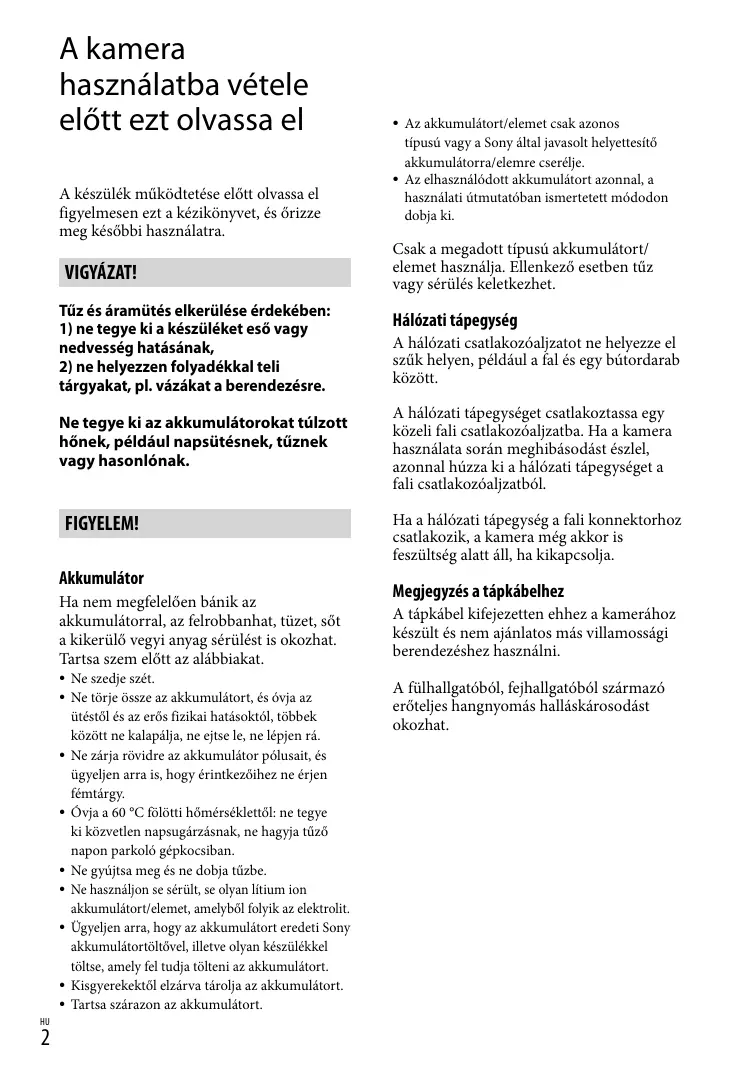 A kamera használatba vétele előtt ezt olvassa el A készülék működtetése előtt olvassa el figyelmesen ezt a kézikönyvet, és őrizze meg későbbi használatra. VIGYÁZAT! Tűz és áramütés elkerülése érdekében:
