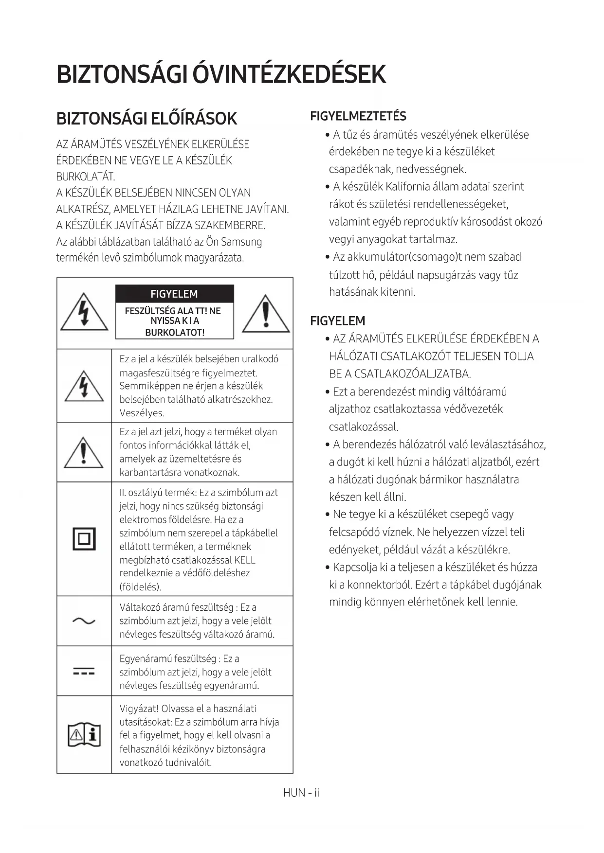 AZ ÁRAMÜTÉS VESZÉLYÉNEK ELKERÜLÉSE ÉRDEKÉBEN NE VEGYE LE A KÉSZÜLÉK BURKOLATÁT. A KÉSZÜLÉK BELSEJÉBEN NINCSEN OLYAN ALKATRÉSZ, AMELYET HÁZILAG LEHETNE JAVÍTANI. A KÉSZÜLÉK JAVÍTÁSÁT BÍZZA SZAKEMBERRE. Az alábbi táblázatban található az Ön Samsung termékén levő szimbólumok magyarázata. FIGYELEM FESZÜLTSÉGALATT!NENYISSA K I A BURKOLATOT!Ez a jel a készülék belsejében uralkodó magasfeszültségre gyelmeztet. Semmiképpen ne érjen a készülék belsejében található alkatrészekhez. Veszélyes.Ez a jel azt jelzi, hogy a terméket olyan fontos információkkal látták el, amelyek az üzemeltetésre és karbantartásra vonatkoznak.II. osztályú termék: Ez a szimbólum azt jelzi, hogy nincs szükség biztonsági elektromos földelésre. Ha ez a szimbólum nem szerepel a tápkábellel ellátott terméken, a terméknek megbízható csatlakozással KELL rendelkeznie a védőföldeléshez (földelés). Váltakozó áramú feszültség : Ez aszimbólum azt jelzi, hogy a vele jelöltnévleges feszültség váltakozó áramú.Egyenáramú feszültség : Ez a szimbólum azt jelzi, hogy a vele jelölt névleges feszültség egyenáramú.Vigyázat! Olvassa el a használati utasításokat: Ez a szimbólum arra hívja fel a gyelmet, hogy el kell olvasni a felhasználói kézikönyv biztonságra vonatkozó tudnivalóit. FIGYELMEZTETÉS