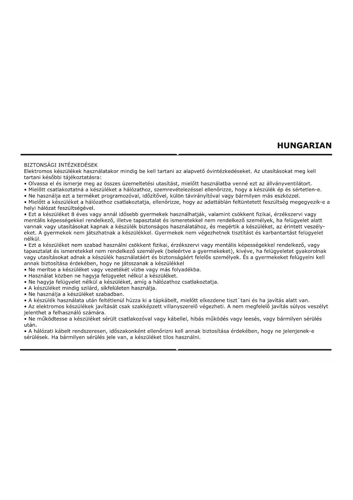 - Ezt a készüléket 8 éves vagy annál idősebb gyermekek használhatják, valamint csökkent fizikai, érzékszervi vagy mentális képességekkel rendelkező, illetve tapasztalat és ismeretekkel nem rendelkező személyek, ha felügyelet alatt vannak vagy utasításokat kapnak a készülék biztonságos használatához, és megértik a készüléket, az érintett veszély- eket. A gyermekek nem játszhatnak a készülékkel. Gyermekek nem végezhetnek tisztítást és karbantartást felügyelet nélkül.