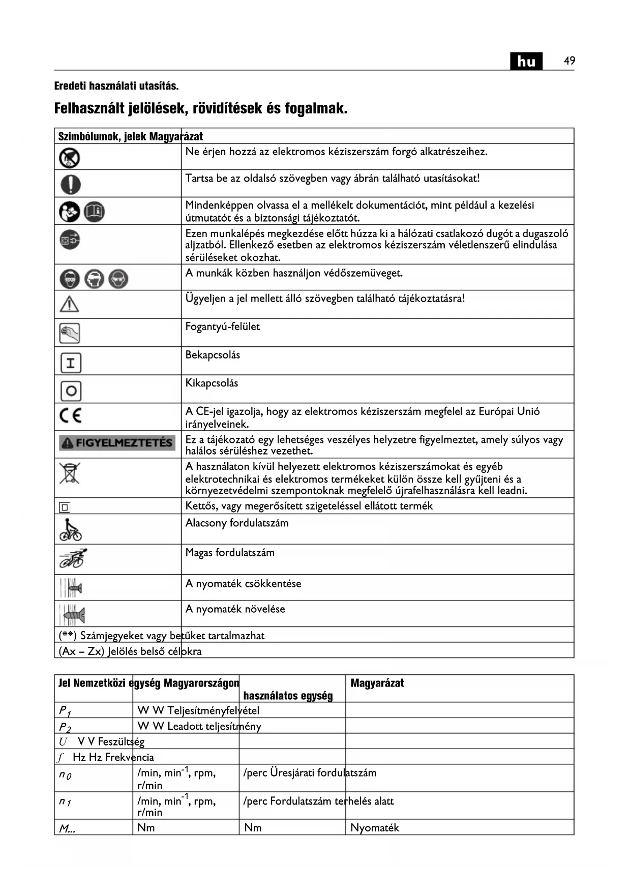 Eredeti használati utasítás. Felhasznált jelölések, rövidítések és fogalmak. Szimbólumok, jelek Magyarázat Ne érjen hozzá az elektromos kéziszerszám forgó alkatrészeihez. Tartsa be az oldalsó szövegben vagy ábrán található utasításokat! Mindenképpen olvassa el a mellékelt dokumentációt, mint például a kezelési útmutatót és a biztonsági tájékoztatót. Ezen munkalépés megkezdése előtt húzza ki a hálózati csatlakozó dugót a dugaszoló aljzatból. Ellenkező esetben az elektromos kéziszerszám véletlenszerű elindulása sérüléseket okozhat. A munkák közben használjon védőszemüveget. Ügyeljen a jel mellett álló szövegben található tájékoztatásra! Fogantyú-felület Bekapcsolás Kikapcsolás A CE-jel igazolja, hogy az elektromos kéziszerszám megfelel az Európai Unió irányelveinek. Ez a tájékozató egy lehetséges veszélyes helyzetre figyelmeztet, amely súlyos vagy halálos sérüléshez vezethet. A használaton kívül helyezett elektromos kéziszerszámokat és egyéb elektrotechnikai és elektromos termékeket külön össze kell gyűjteni és a környezetvédelmi szempontoknak megfelelő újrafelhasználásra kell leadni. Kettős, vagy megerősített szigeteléssel ellátott termék Alacsony fordulatszám Magas fordulatszám A nyomaték csökkentése A nyomaték növelése (**) Számjegyeket vagy betűket tartalmazhat (Ax – Zx) Jelölés belső célokra Jel Nemzetközi egység Magyarországon használatos egység Magyarázat