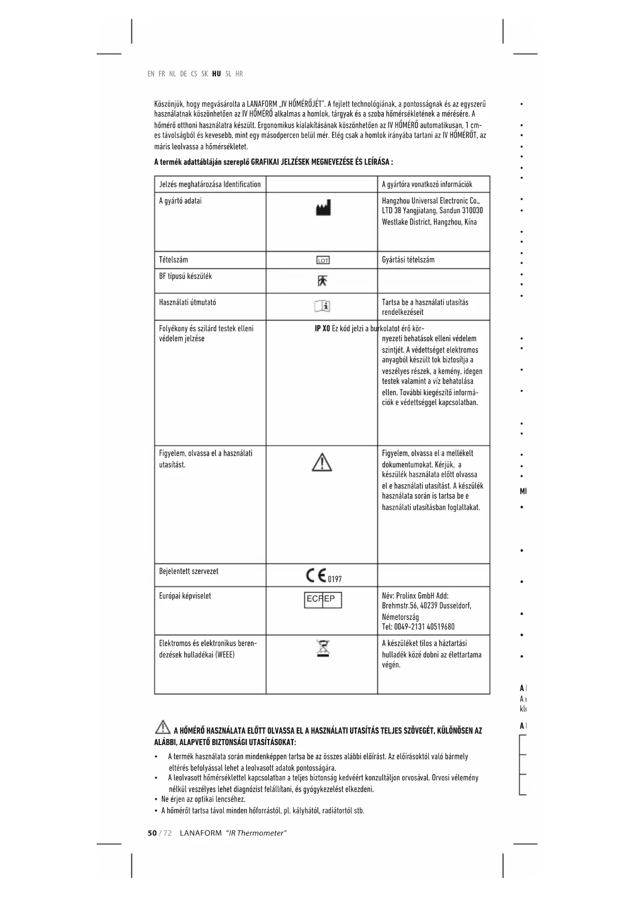 Zdravotnícka pomôcka - Trieda IIa My, spoločnosť Lanaform SA, vyhlasujeme, že teplomer IR LA090112 je v súlade s európskou smernicou 93/42/ES o zdravotníckych pomôckach a jej poslednou zmenou a doplnením 2007/47/ES. KONTAKTNÉ ÚDAJE Výrobok vyrába: Hangzhou Universal Electronic Co., LTD 38 Yangjiatang, Sandun 310030 Westlake District, Hangzhou China Výrobok distribuuje: Lanaform SA Rue de La légende 55, B-4141 Belgium Autorizovaný zástupca pre Európu: Name: Prolinx GmbH Add: Brehmstr.56, 40239 Dusseldorf Germany Tel: 0049-2131 4051968050 / 72 LANAFORM “IR Thermometer” EN FR NL DE CS SK HU SL HR Köszönjük, hogy megvásárolta a LANAFORM „IV HŐMÉRŐJÉT”. A fejlett technológiának, a pontosságnak és az egyszerű használatnak köszönhetően az IV HŐMÉRŐ alkalmas a homlok, tárgyak és a szoba hőmérsékletének a mérésére. A hőmérő otthoni használatra készült. Ergonomikus kialakításának köszönhetően az IV HŐMÉRŐ automatikusan, 1 cm- es távolságból és kevesebb, mint egy másodpercen belül mér. Elég csak a homlok irányába tartani az IV HŐMÉRŐT, az máris leolvassa a hőmérsékletet. A termék adattábláján szereplő GRAFIKAI JELZÉSEK MEGNEVEZÉSE ÉS LEÍRÁSA : Jelzés meghatározása Identication A gyártóra vonatkozó információk A gyártó adatai Hangzhou Universal Electronic Co., LTD 38 Yangjiatang, Sandun 310030 Westlake District, Hangzhou, Kína Tételszám LOT Gyártási tételszám BF típusú készülék Használati útmutató Tartsa be a használati utasítás rendelkezéseit Folyékony és szilárd testek elleni védelem jelzése IP X0 Ez kód jelzi a burkolatot érő kör- nyezeti behatások elleni védelem szintjét. A védettséget elektromos anyagból készült tok biztosítja a veszélyes részek, a kemény, idegen testek valamint a víz behatolása ellen. További kiegészítő informá- ciók e védettséggel kapcsolatban. Figyelem, olvassa el a használati utasítást. Figyelem, olvassa el a mellékelt dokumentumokat. Kérjük, a készülék használata előtt olvassa el e használati utasítást. A készülék használata során is tartsa be e használati utasításban foglaltakat. Bejelentett szervezet