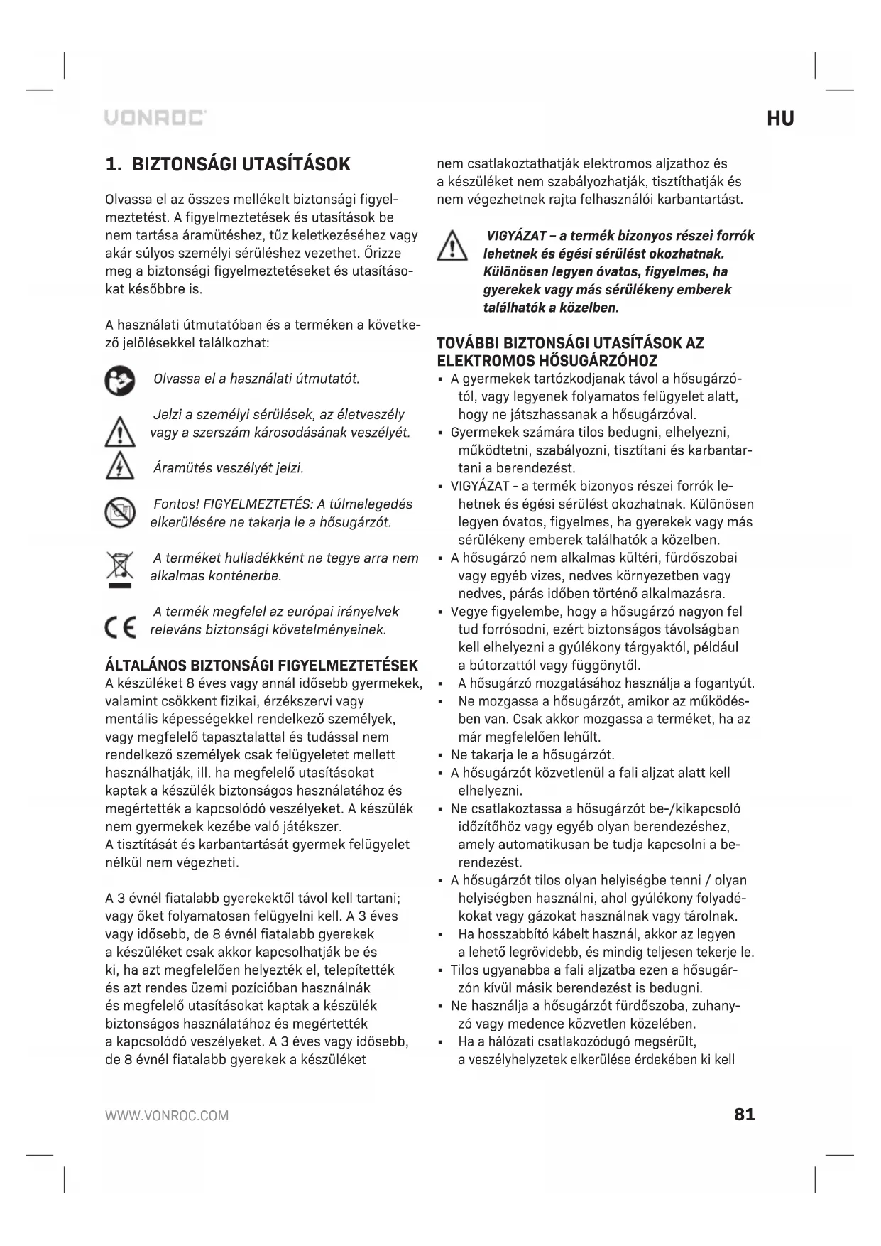 Olvassa el az összes mellékelt biztonsági figyel- meztetést. Afigyelmeztetések és utasítások be nem tartása áramütéshez, tűz keletkezéséhez vagy akár súlyos személyi sérüléshez vezethet. Őrizze meg abiztonsági figyelmeztetéseket és utasításo- kat későbbre is. Ahasználati útmutatóban és aterméken akövetke- ző jelölésekkel találkozhat: Olvassa el ahasználati útmutatót. Jelzi aszemélyi sérülések, az életveszély vagy aszerszám károsodásának veszélyét. Áramütés veszélyét jelzi. Fontos! FIGYELMEZTETÉS: Atúlmelegedés elkerülésére ne takarja le ahősugárzót. Aterméket hulladékként ne tegye arra nem alkalmas konténerbe. Atermék megfelel az európai irányelvek releváns biztonsági követelményeinek.