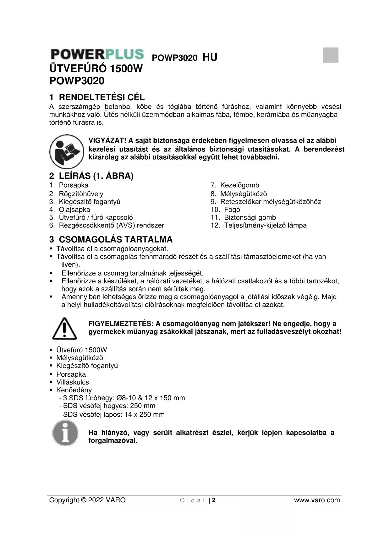 - Amikor munkát végez, mindig két kézzel tartsa a készüléket, és győződjön meg, hogy biztosan áll.POWP3020 HU Copyright © 2022 VARO O l d a l | 6 www.varo.com
