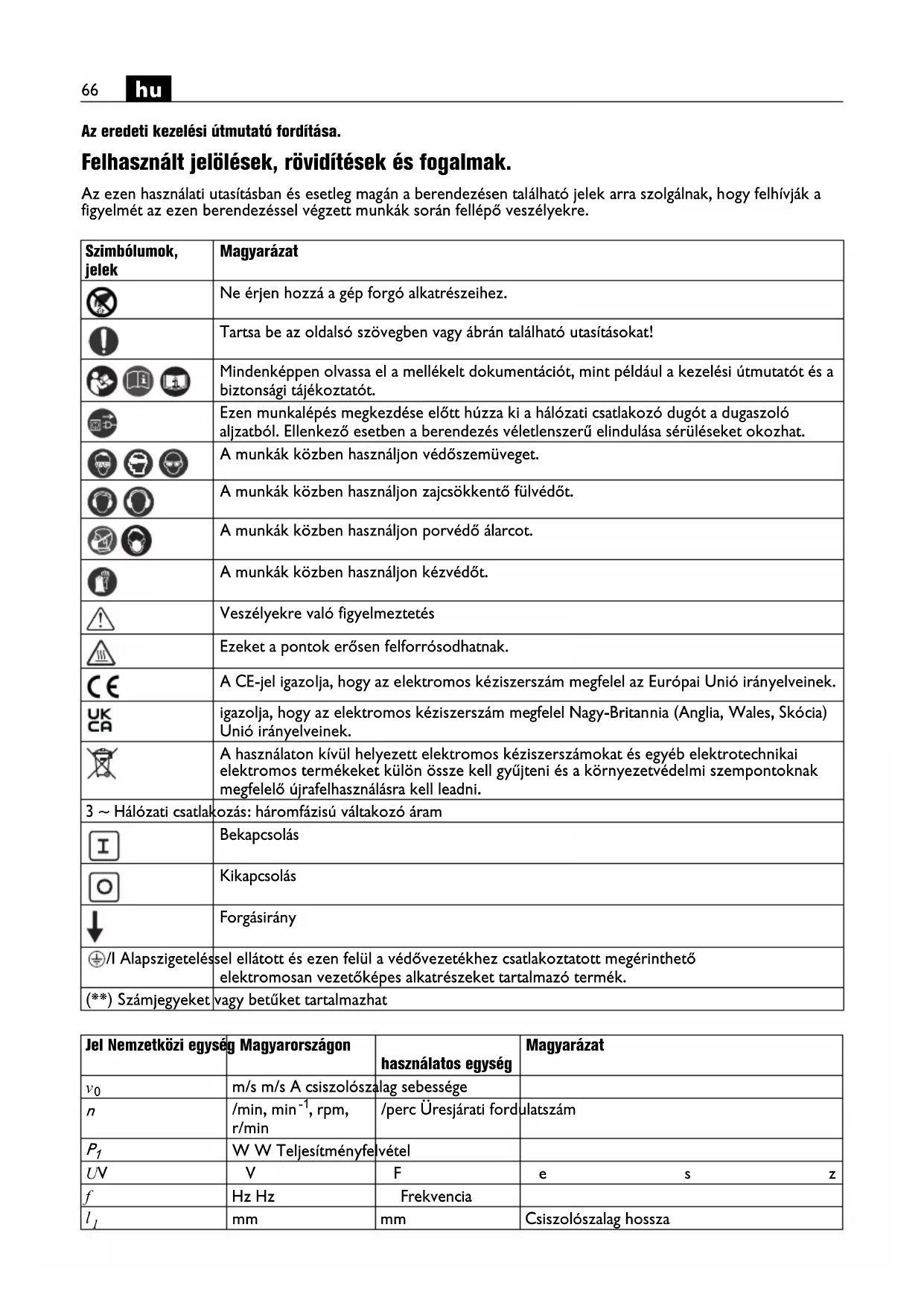 Az eredeti kezelési útmutató fordítása. Felhasznált jelölések, rövidítések és fogalmak. Az ezen használati utasításban és esetleg magán a berendezésen található jelek arra szolgálnak, hogy felhívják a figyelmét az ezen berendezéssel végzett munkák során fellépő veszélyekre. Szimbólumok, jelek Magyarázat Ne érjen hozzá a gép forgó alkatrészeihez. Tartsa be az oldalsó szövegben vagy ábrán található utasításokat! Mindenképpen olvassa el a mellékelt dokumentációt, mint például a kezelési útmutatót és a biztonsági tájékoztatót. Ezen munkalépés megkezdése előtt húzza ki a hálózati csatlakozó dugót a dugaszoló aljzatból. Ellenkező esetben a berendezés véletlenszerű elindulása sérüléseket okozhat. A munkák közben használjon védőszemüveget. A munkák közben használjon zajcsökkentő fülvédőt. A munkák közben használjon porvédő álarcot. A munkák közben használjon kézvédőt. Veszélyekre való figyelmeztetés Ezeket a pontok erősen felforrósodhatnak. A CE-jel igazolja, hogy az elektromos kéziszerszám megfelel az Európai Unió irányelveinek. igazolja, hogy az elektromos kéziszerszám megfelel Nagy-Britannia (Anglia, Wales, Skócia) Unió irányelveinek. A használaton kívül helyezett elektromos kéziszerszámokat és egyéb elektrotechnikai elektromos termékeket külön össze kell gyűjteni és a környezetvédelmi szempontoknak megfelelő újrafelhasználásra kell leadni. 3 ~ Hálózati csatlakozás: háromfázisú váltakozó áram Bekapcsolás Kikapcsolás Forgásirány /I Alapszigeteléssel ellátott és ezen felül a védővezetékhez csatlakoztatott megérinthető elektromosan vezetőképes alkatrészeket tartalmazó termék. (**) Számjegyeket vagy betűket tartalmazhat Jel Nemzetközi egység Magyarországon használatos egység Magyarázat