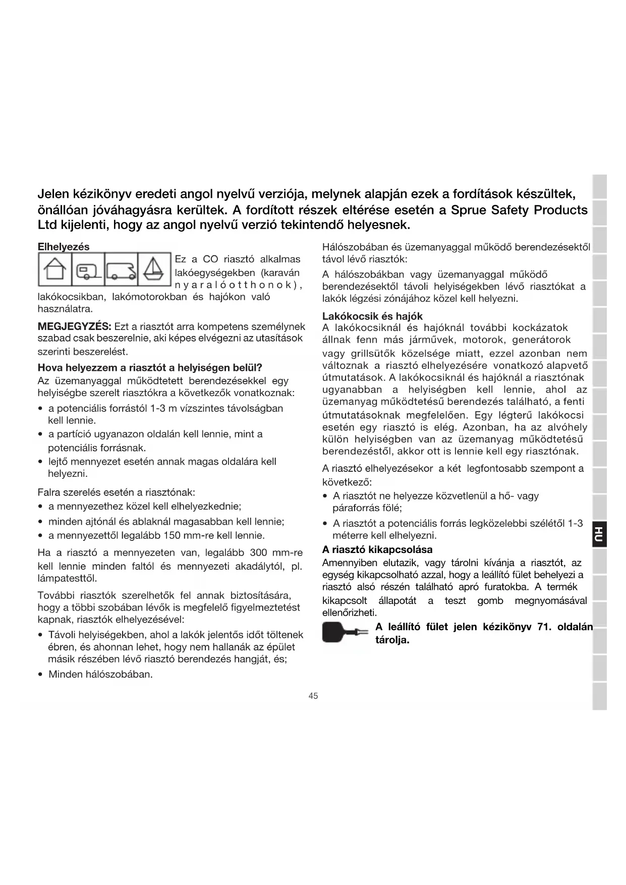 - A riasztót a potenciális forrás legközelebbi szélétől 1-3 méterre kell elhelyezni. A riasztó kikapcsolása Amennyiben elutazik, vagy tárolni kívánja a riasztót, az egység kikapcsolható azzal, hogy a leállító fület behelyezi a riasztó alsó részén található apró furatokba. A termék kikapcsolt állapotát a teszt gomb megnyomásával ellenőrizheti. A leállító fület jelen kézikönyv 71. oldalán tárolja. Jelen kézikönyv eredeti angol nyelvű verziója, melynek alapján ezek a fordítások készültek, önállóan jóváhagyásra kerültek. A fordított részek eltérése esetén a Sprue Safety Products Ltd kijelenti, hogy az angol nyelvű verzió tekintendő helyesnek.46