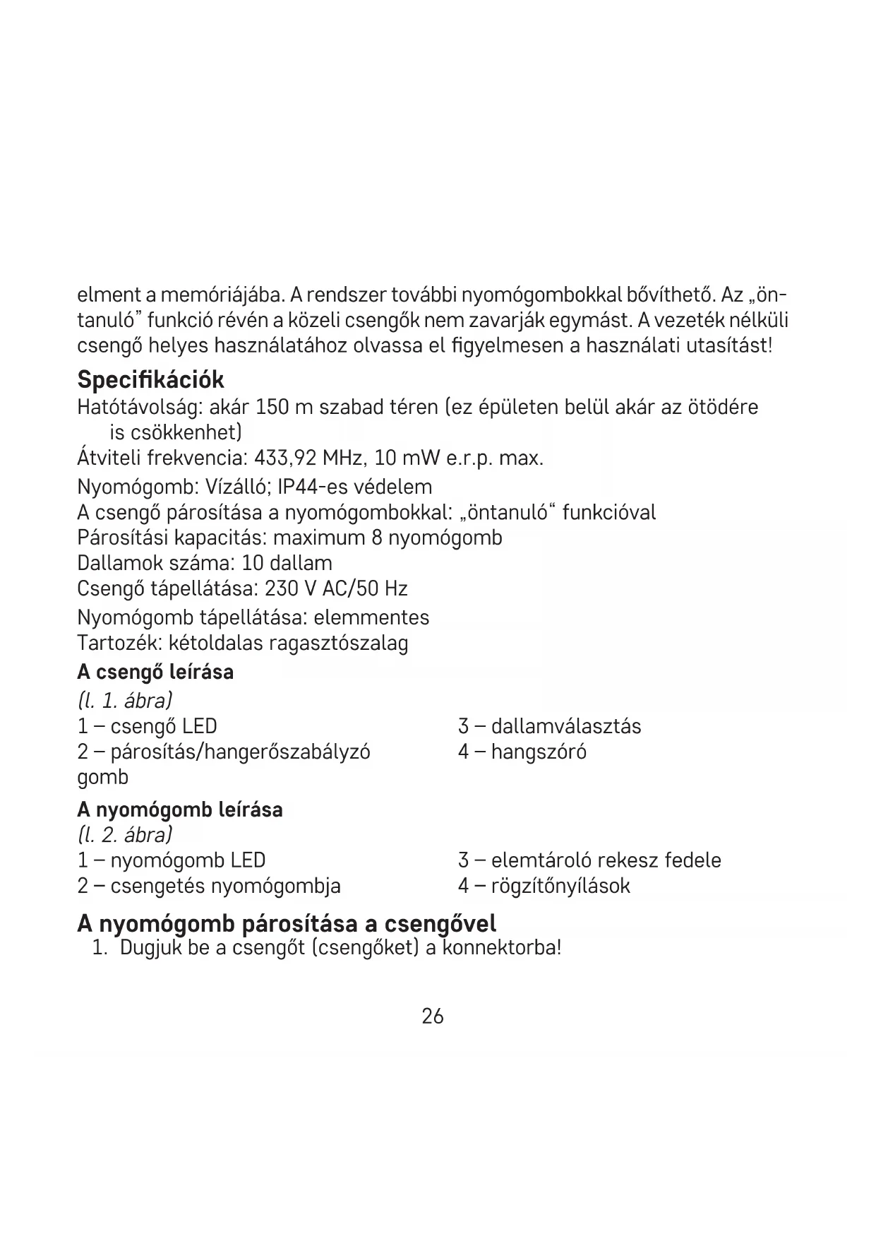 párosítási üzemmódba kapcsol, amely 25 másodpercig tart. Ez idő alatt nyomjuk meg a csengő nyomógombot és ha a csengő megszólal, meg- történt a gomb párosítása a csengővel. Ezzel automatikusan lezárul az „öntanuló“ üzemmód (a csengő LED-je nem kialszik).