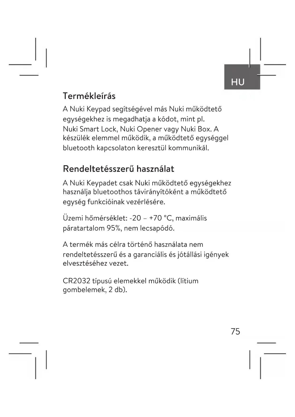 Termékleírás A Nuki Keypad segítségével más Nuki működtető egységekhez is megadhatja a kódot, mint pl. Nuki Smart Lock, Nuki Opener vagy Nuki Box. A készülék elemmel működik, a működtető egységgel bluetooth kapcsolaton keresztül kommunikál. Rendeltetésszerű használat A Nuki Keypadet csak Nuki működtető egységekhez használja bluetoothos távirányítóként a működtető egység funkcióinak vezérlésére. Üzemi hőmérséklet: -20 – +70 °C, maximális páratartalom 95%, nem lecsapódó. A termék más célra történő használata nem rendeltetésszerű és a garanciális és jótállási igények elvesztéséhez vezet. CR2032 típusú elemekkel működik (lítium gombelemek, 2 db).76