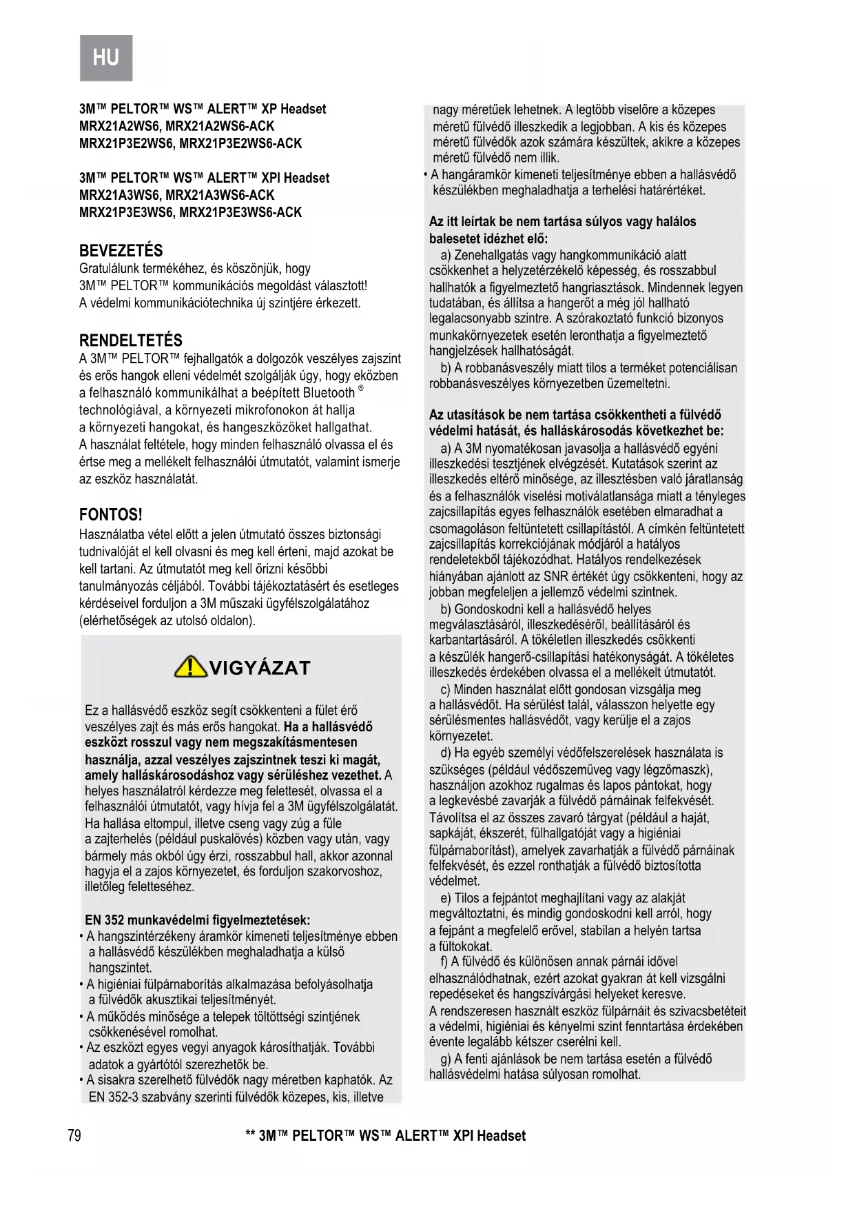 ISKLJUČIVI SU. ZABRANJENE SU IZMJENE: Izmjene ovog uređaja ne smiju se provoditi bez pisane suglasnosti tvrtke 3M. Neovlaštene izmjene mogu poništiti jamstvo i ovlaštenje korisnika za rukovanje uređajem. ** 3M™ PELTOR™ WS™ ALERT™ XPI Headset79 3M™ PELTOR™ WS™ ALERT™ XP Headset MRX21A2WS6, MRX21A2WS6-ACK MRX21P3E2WS6, MRX21P3E2WS6-ACK 3M™ PELTOR™ WS™ ALERT™ XPI HeadsetMRX21A3WS6, MRX21A3WS6-ACK MRX21P3E3WS6, MRX21P3E3WS6-ACK BEVEZETÉS Gratulálunk termékéhez, és köszönjük, hogy 3M™ PELTOR™ kommunikációs megoldást választott! A védelmi kommunikációtechnika új szintjére érkezett. RENDELTETÉS A 3M™ PELTOR™ fejhallgatók a dolgozók veszélyes zajszint és erős hangok elleni védelmét szolgálják úgy, hogy eközben a felhasználó kommunikálhat a beépített Bluetooth