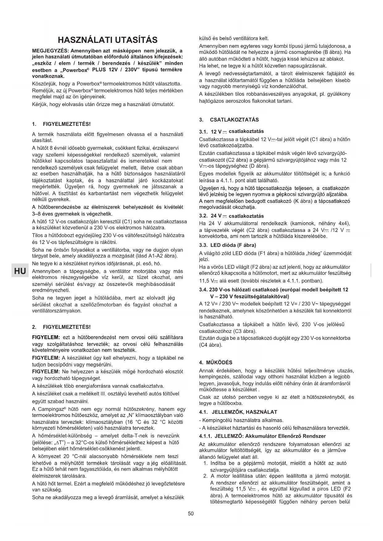 A termék használata előtt figyelmesen olvassa el a használati utasítást. A hűtőt 8 évnél idősebb gyermekek, csökkent fizikai, érzékszervi vagy szellemi képességekkel rendelkező személyek, valamint hűtőkkel kapcsolatos tapasztalattal és ismeretekkel nem rendelkező személyek csak felügyelet mellett, illetve csak abban az esetben használhatják, ha a hűtő biztonságos használatáról tájékoztatást kaptak, és a használattal járó kockázatokat megértették. Ügyeljen rá, hogy gyermekek ne játsszanak a hűtővel. A tisztítást és karbantartást nem végezhetik felügyelet nélküli gyerekek. A hűtőberendezésbe az élelmiszerek behelyezését és kivételét 3–8 éves gyermekek is végezhetik. A hűtő 12 V-os csatlakozóján keresztül (C1) soha ne csatlakoztassa a készüléket közvetlenül a 230 V-os elektromos hálózatra. Tilos a hűtődobozt egyidejűleg 230 V-os váltófeszültségű hálózatra és 12 V-os tápfeszültségre is rákötni. Soha ne öntsön folyadékot a ventillátorba, vagy ne dugjon olyan tárgyat bele, amely akadályozza a mozgását (lásd A1-A2 ábra). Ne tegye ki a készüléket nyirkos időjárásnak, pl. eső, hó. Amennyiben a tápegységbe, a ventilátor motorjába vagy más elektromos részegységekbe víz kerül, az tüzet okozhat, ami személyi sérülést és/vagy az összetevők meghibásodását eredményezheti. Soha ne tegyen jeget a hűtöládába, mert az elolvadt jég sérülést okozhat a szellőzőmotorban és fagyást okozhat a ventillátorszárnyakon.