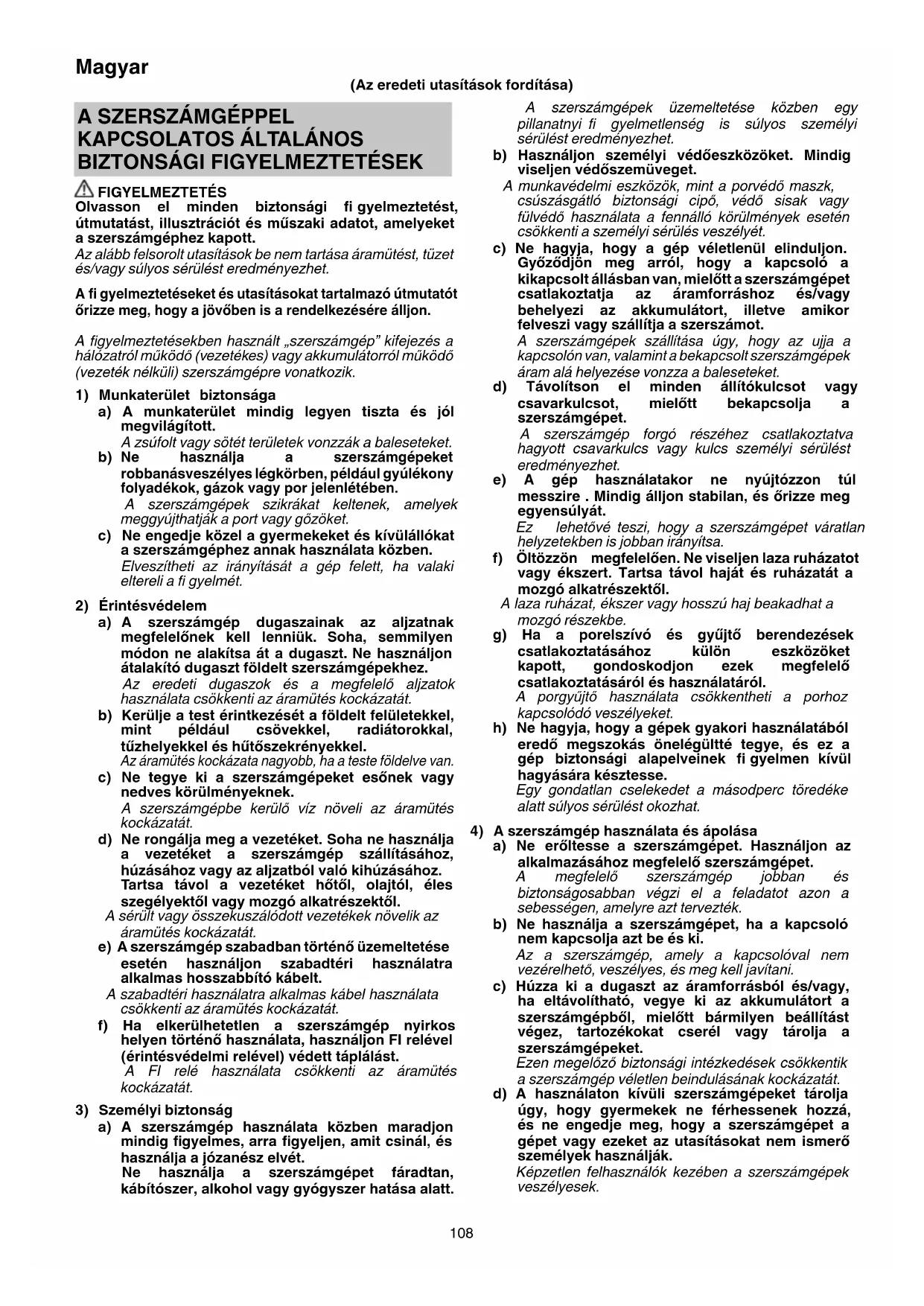 FIGYELMEZTETÉS Olvasson el minden biztonsági fi gyelmeztetést, útmutatást, illusztrációt és műszaki adatot, amelyeket a szerszámgéphez kapott. Az alább felsorolt utasítások be nem tartása áramütést, tüzet és/vagy súlyos sérülést eredményezhet. A fi gyelmeztetéseket és utasításokat tartalmazó útmutatót őrizze meg, hogy a jövőben is a rendelkezésére álljon. A fi gyelmeztetésekben használt „szerszámgép” kifejezés a hálózatról működő (vezetékes) vagy akkumulátorról működő (vezeték nélküli) szerszámgépre vonatkozik.