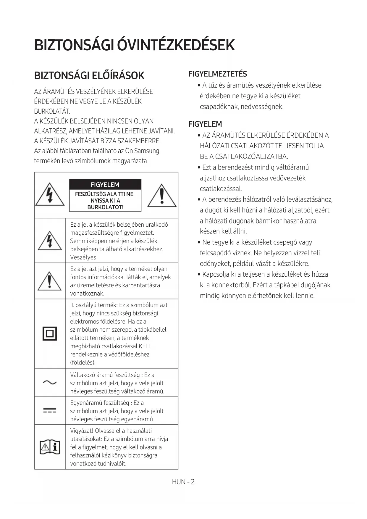 AZ ÁRAMÜTÉS VESZÉLYÉNEK ELKERÜLÉSE ÉRDEKÉBEN NE VEGYE LE A KÉSZÜLÉK BURKOLATÁT. A KÉSZÜLÉK BELSEJÉBEN NINCSEN OLYAN ALKATRÉSZ, AMELYET HÁZILAG LEHETNE JAVÍTANI. A KÉSZÜLÉK JAVÍTÁSÁT BÍZZA SZAKEMBERRE. Az alábbi táblázatban található az Ön Samsung termékén levő szimbólumok magyarázata. FIGYELEM FESZÜLTSÉG ALA TT! NE NYISSA K I A BURKOLATOT!Ez a jel a készülék belsejében uralkodó magasfeszültségre gyelmeztet. Semmiképpen ne érjen a készülék belsejében található alkatrészekhez. Veszélyes.Ez a jel azt jelzi, hogy a terméket olyan fontos információkkal látták el, amelyek az üzemeltetésre és karbantartásra vonatkoznak.II. osztályú termék: Ez a szimbólum azt jelzi, hogy nincs szükség biztonsági elektromos földelésre. Ha ez a szimbólum nem szerepel a tápkábellel ellátott terméken, a terméknek megbízható csatlakozással KELL rendelkeznie a védőföldeléshez (földelés). Váltakozó áramú feszültség : Ez a szimbólum azt jelzi, hogy a vele jelölt névleges feszültség váltakozó áramú.Egyenáramú feszültség : Ez a szimbólum azt jelzi, hogy a vele jelölt névleges feszültség egyenáramú.Vigyázat! Olvassa el a használati utasításokat: Ez a szimbólum arra hívja fel a gyelmet, hogy el kell olvasni a felhasználói kézikönyv biztonságra vonatkozó tudnivalóit. FIGYELMEZTETÉS