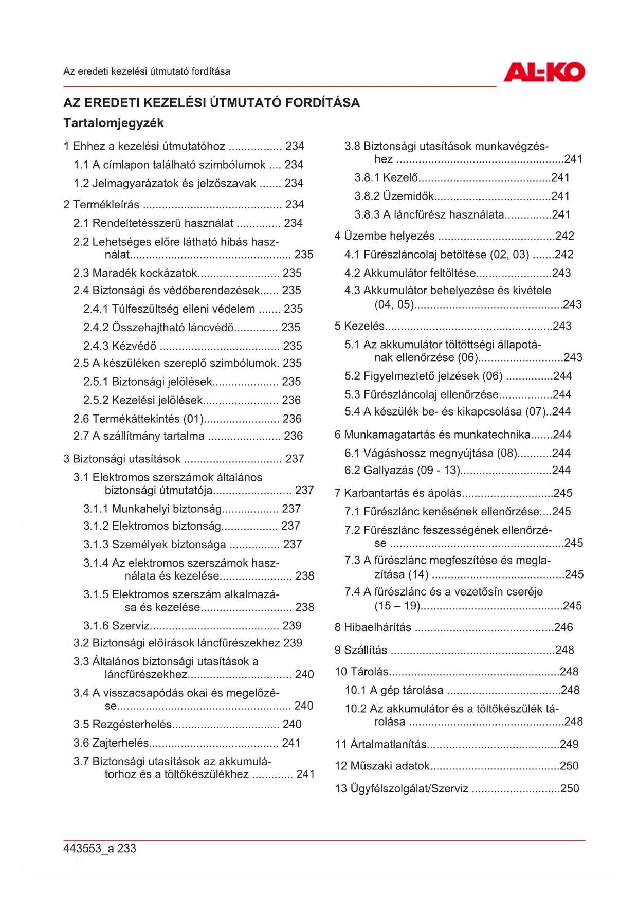 A garanciával, javítással vagy pótalkatrészekkel kapcsolatos kérdések esetén kérjük, forduljon a legközelebbi AL-KOszervizhez. Ezeket megtalál- ja az interneten a következő oldalon: www.alko-garden.com/service-contacts A pótalkatrészekkel kapcsolatos további informá- ciók itt találhatók: www.alko-garden.com/spareparts443553_a 251 Információk a megfelelőségi nyilatkozathoz 14 INFORMÁCIÓK A MEGFELELŐSÉGI NYILATKOZATHOZ Kizárólagos felelősségünk tudatában kijelentjük, hogy a termék a piacon értékesített formájában teljesíti a harmonizált EU-irányelvek követelmé- nyeit, az EU biztonsági szabványait és a termék- specifikus szabványokat. A megfelelőségi nyilat- kozat a kezelési útmutató része, és a gépnél kell tartani. 15 GARANCIA A berendezés esetleges anyag- és gyártási hibáinak elhárítása javítással vagy alkatrészcserével törté- nik a törvényben előírt jótállási időn belül. A jótállási határidőt azon ország jogrendszere határozza meg, ahol a berendezést vásárolták. A garancia kizárólag akkor érvényes, ha: