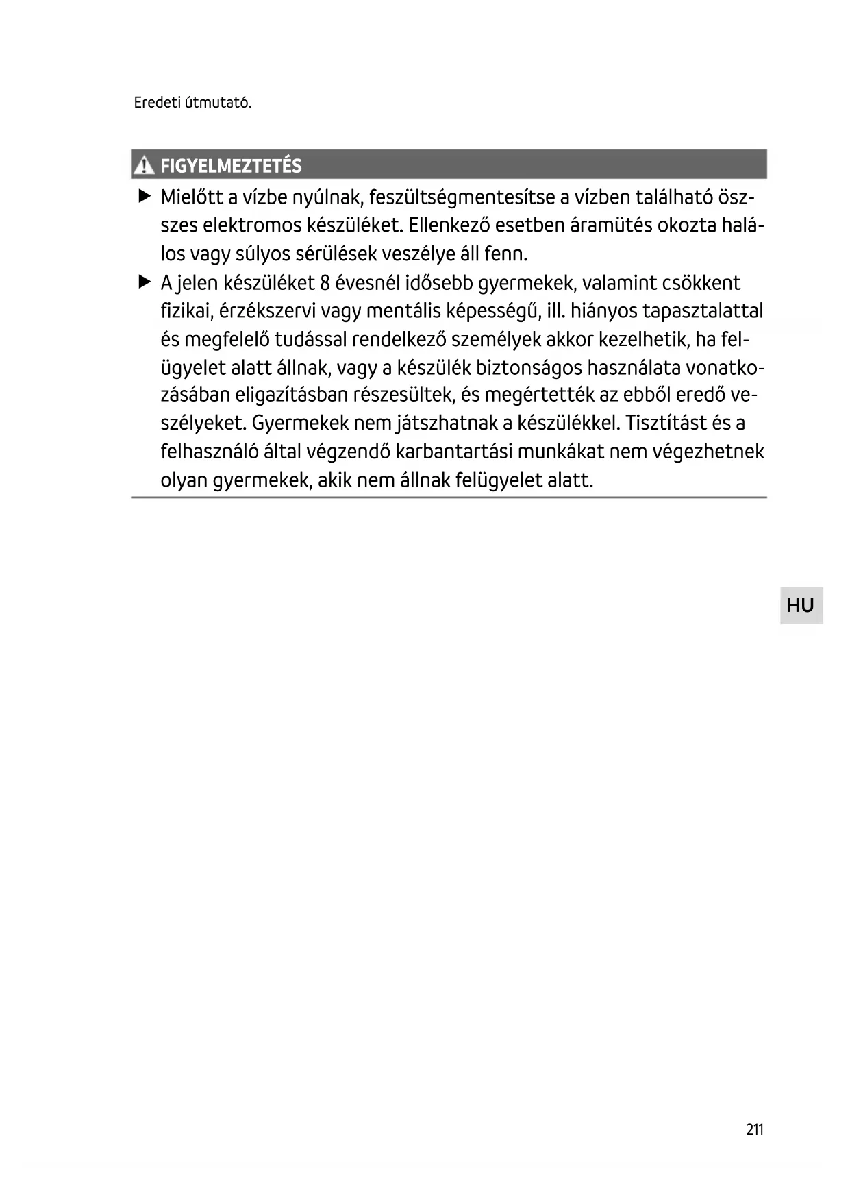 FIGYELMEZTETÉS Mielőtt a vízbe nyúlnak, feszültségmentesítse a vízben található ösz- szes elektromos készüléket. Ellenkező esetben áramütés okozta halá- los vagy súlyos sérülések veszélye áll fenn. A jelen készüléket 8 évesnél idősebb gyermekek, valamint csökkent fizikai, érzékszervi vagy mentális képességű, ill. hiányos tapasztalattal és megfelelő tudással rendelkező személyek akkor kezelhetik, ha fel- ügyelet alatt állnak, vagy a készülék biztonságos használata vonatko- zásában eligazításban részesültek, és megértették az ebből eredő ve- szélyeket. Gyermekek nem játszhatnak a készülékkel. Tisztítást és a felhasználó által végzendő karbantartási munkákat nem végezhetnek olyan gyermekek, akik nem állnak felügyelet alatt.212 Biztonsági útmutatások Elektromos csatlakoztatás