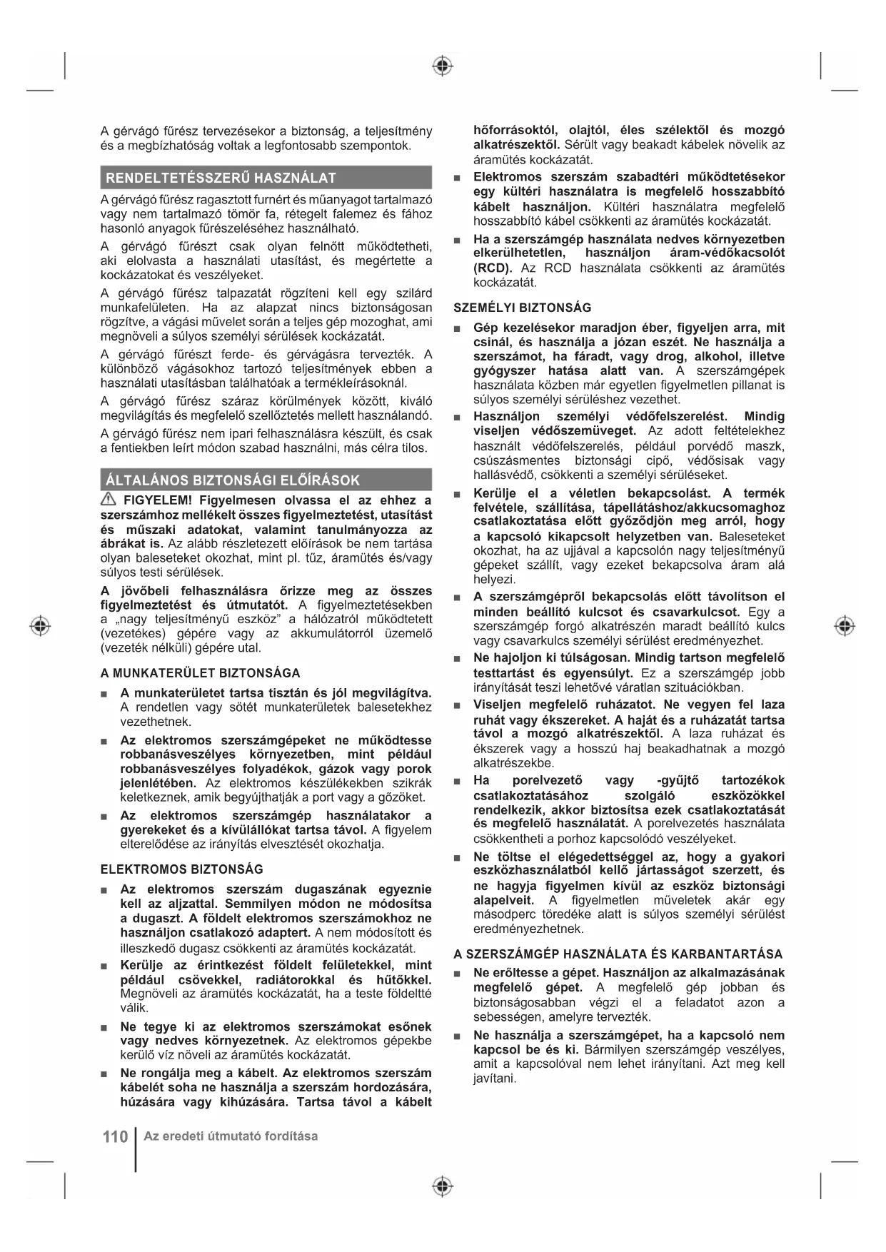 Az eredeti útmutató fordítása■ A munka megkezdése előtt bekapcsolt motor nélkül végezzen egy próbavágást a vágótárcsa helyzete, a védőberendezések működése, a gép más részei és a munkadarab helyzete ellenőrzése céljából. ■ Soha ne hagyja felügyelet nélkül a gépet. ■ Ne vigyen fel kenőanyagot a fűrészlapra, ha forog. ■ Ne hajtson végre semmilyen tisztítási vagy karbantartási műveletet, ha a gép még forog és a fej nincs nyugalmi pozícióban. ■ Ne próbálja hirtelen megállítani a gépet, ha mozgásban van, úgy, hogy beakaszt egy szerszámot vagy más tárgyat a fűrészlapba, mert ez súlyos balesetet okozhat. ■ Karbantartás vagy fűrésztárcsacsere előtt húzza ki a termék csatlakozódugóját a konnektorból, vagy vegye ki az akkumulátort. ■ Figyeljen oda a fűrészlap be- és kicsomagolására, a fűrészlap éles hegyei könnyen sérülést okozhatnak. ■ Használjon fűrészlaptartót vagy viseljen védőkesztyűt, ha fűrészlappal dolgozik. ■ A fűrészlapot az eredeti csomagolásában vagy más megfelelő csomagolásban tartsa és tárolja, száraz körülmények között, távol az olyan vegyszerektől, amelyek károsíthatnák.