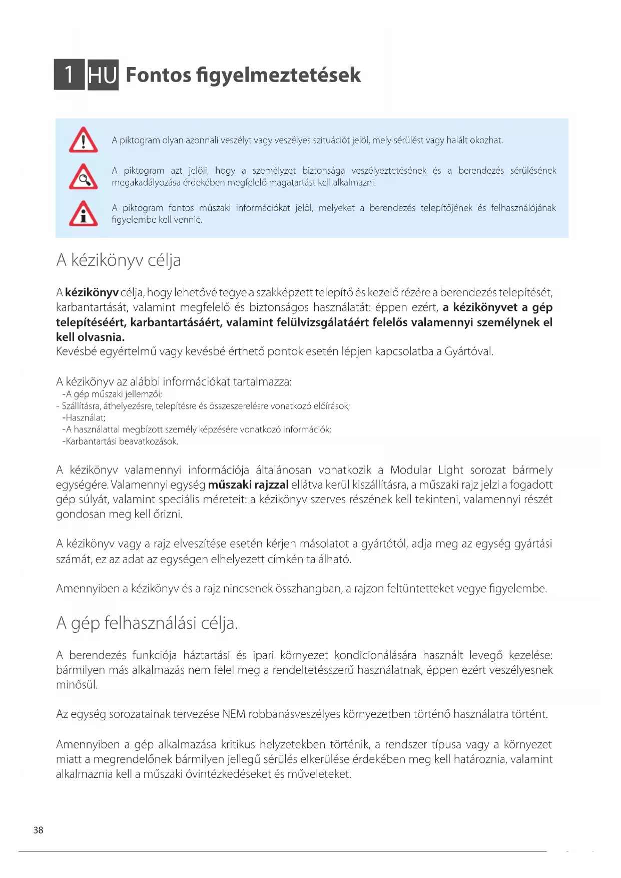 Biztonsági szabályok A gép használatához és karbantartásához előírt illetékességek Általános kezelő: Az elektromos vezérlőszekrény kapcsolótábláján lévő vezérlők révén a gép irányítására ENGEDÉLLYEL rendelkező személy. Csak a gép vezérlésének műveleteit, bekapcsolást/kikapcsolást végzi (Szakképzett) mechanikai karbantartó: A mechanikus egységek karbantartási, beállítási, csere és javítási beavatkozásaira ENGEDÉLLYEL rendelkező személy. Ismernie kell a mechanikus rendszereket, vagyis képesnek kell lennie mechanikus karbantartás megfelelő és biztonságos elvégzésére, rendelkeznie kell elméleti előkészítéssel és manuális tapasztalattal. NINCS ENGEDÉLYE az elektromos rendszereken végzett karbantartásokra. A gyártó műszaki szakembere (szakképzett): Bármilyen szituációban komplex műveletek végzésére ENGEDÉLLYEL rendelkező személy. A felhasználóval összhangban végzi a munkáját. (Szakképzett) elektromos karbantartó szakember: Elektromos jellegű, beállítási, karbantartási, valamint elektromos javítási beavatkozások végzésére ENGEDÉLLYEL rendelkező személy. ENGEDÉLLYEL rendelkezik feszültség alatt lévő elektromos szekrényeken és elosztódobozokon történő beavatkozásra. Elektronikus vagy elektrotechnikus képzettséggel kell rendelkeznie, vagyis képesnek kell lennie elektromos rendszereken történő megfelelő és biztonságos beavatkozásra, rendelkeznie kell elméleti előkészülettel és bizonyított tapasztalattal. NINCS ENGEDÉLYE mechanikai jellegű beavatkozások végzésére. A gép telepítéséhez előírt illetékességek A telepítő szakembereknek a beavatkozásokat saját szakképzettségüknek megfelelően kell elvégezni: saját illetékességén kívül eső valamennyi beavatkozást (pl.: elektromos bekötések) speciális és szakképzett kezelőknek kell elvégezniük annak érdekében, hogy ne veszélyeztessék saját biztonságukat, és a berendezéssel kapcsolatba kerülő más személyek biztonságát. A gép szállításáért és mozgatásáért felelős kezelő: engedéllyel rendelkező, szállítóeszközök és emelőeszközök használatában jártas személy. Műszaki telepítő személy: a gyártó vagy megbízottja által biztosított képzett műszaki szakember, aki a gép telepítéséhez szükséges megfelelő műszaki illetékességgel és képzettséggel rendelkezik. Kisegítő személy: a felszerelés emelésének és összeszerelésének irányítási feladatát végző műszaki személy. Megfelelő képzettséggel kell rendelkeznie, valamint információkkal kell rendelkeznie a beavatkozásokkal és a telephely/telepítési hely biztonsági terveire vonatkozóan. A kézikönyvben valamennyi művelethez meghatároztuk a feladat elvégzéséhez illetékes műszaki személyt. A telepítők, felhasználók és karbantartók NEM végezhetnek munkát a gépen, amennyiben: - nincs tapasztalatuk, nem felelősek vagy kiskorúak; - testi károsodással élnek vagy testi és szellemi állapotuk nem tökéletes; - nem rendelkeznek a gép üzemciklusára vonatkozó ismeretekkel; - nem végezték el az elméleti/gyakorlati felkészítő tanfolyamot egy tapasztalt gépkezelő illetve a gyártó szakembere vezetésével. A kézikönyvben valamennyi művelethez meghatároztuk a feladat elvégzéséhez illetékes műszaki személyt.40 A gép telepítése, használata és karbantartása előtt olvassa el figyelmesen a kézikönyvet, őrizze meg a kezelők későbbi tanulmányozása céljából. Ne távolítsa el, ne tépje el és ne írja át semmilyen okból a kézikönyv részeit. Az összes telepítési, felszerelési, elektromos hálózati bekötési, valamint rendes/rendkívüli karbantartási műveletet kizárólag olyan műszaki szakemberek végezhetnek, akik betartják a törvény előírásait, elektromosan kikapcsolták az egységet és egyéni védőfelszerelést (pl. védőkesztyűt, -szemüveget stb.) alkalmaznak, a telepítési célországban érvényes szabványok szerint és a munkahelyi biztonságra és a berendezésekre vonatkozó összes szabványnak megfelelően. A kézikönyvtől eltérő telepítés, használat vagy karbantartás sérüléseket vagy halálos baleseteket okozhat, érvényteleníti a garanciát, és felmenti a gyártót bármilyen felelősség alól. A berendezés mozgatása vagy telepítése során a balesetek megelőzése, valamint saját vagy más személyek biztonságának biztosítása érdekében kötelező védőfelszerelés és a célnak megfelelő eszközök alkalmazása. A gép összeszerelése vagy karbantartása során a munkaterület közelében telepítés végzésével nem megbízott személyek áthaladása vagy tartózkodása NEM engedélyezett. Bármilyen telepítési vagy karbantartási beavatkozás előtt válassza le a berendezést az elektromos hálózatról. A berendezés telepítése előtt ellenőrizze, hogy a rendszerek megfelelnek-e a felhasználás országában érvényes szabványoknak, valamint az azonosító adattáblán található adatoknak. A felhasználónak/telepítő szakembernek kell meggyőződnie a telepítésre vonatkozó statikus és dinamikus stabilitásról, valamint elő kell készítenie a környezetet úgy, hogy illetéktelen és engedéllyel nem rendelkező személyek NE férhessenek a géphez vagy a gép vezérlőihez. A felhasználónak/telepítő szakembernek kell meggyőződnie arról, hogy a környezeti feltételek nem veszélyeztetik-e a személyi és dologi biztonságot a telepítési, felhasználási és karbantartási fázisok alatt. Győződjön meg arról, hogy a levegő beszívás nem elvezetők, égéstermékek vagy egyéb szennyező elemek közelében történik. NE telepítse a berendezést erős szélnek, magas sótartalmú környezetnek, nyílt lángnak vagy 40°C (104°F) foknál magasabb hőmérsékletnek kitett helyekre. A telepítés végén adjon megf