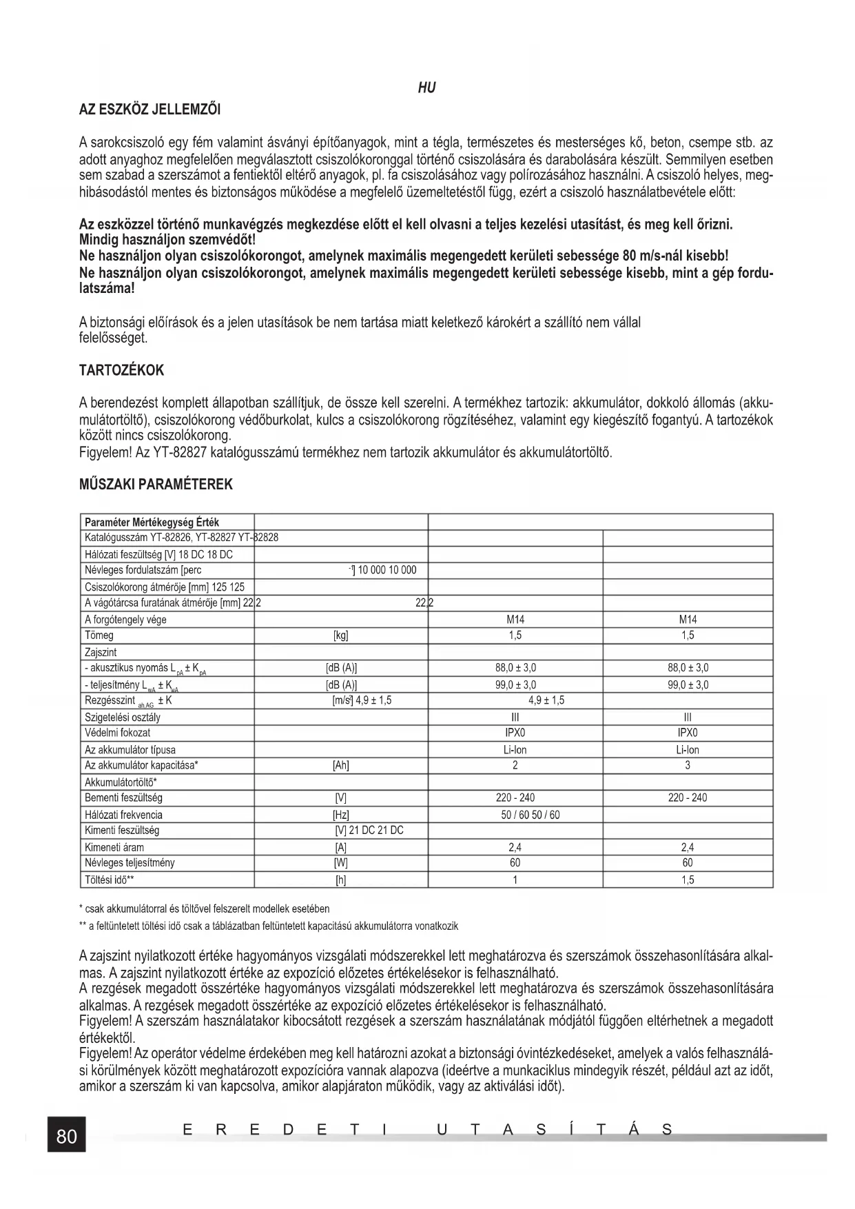 - csak akkumulátorral és töltővel felszerelt modellek esetében ** a feltüntetett töltési idő csak a táblázatban feltüntetett kapacitású akkumulátorra vonatkozik A zajszint nyilatkozott értéke hagyományos vizsgálati módszerekkel lett meghatározva és szerszámok összehasonlítására alkal- mas. A zajszint nyilatkozott értéke az expozíció előzetes értékelésekor is felhasználható. A rezgések megadott összértéke hagyományos vizsgálati módszerekkel lett meghatározva és szerszámok összehasonlítására alkalmas. A rezgések megadott összértéke az expozíció előzetes értékelésekor is felhasználható. Figyelem! A szerszám használatakor kibocsátott rezgések a szerszám használatának módjától függően eltérhetnek a megadott értékektől. Figyelem! Az operátor védelme érdekében meg kell határozni azokat a biztonsági óvintézkedéseket, amelyek a valós felhasználá- si körülmények között meghatározott expozícióra vannak alapozva (ideértve a munkaciklus mindegyik részét, például azt az időt, amikor a szerszám ki van kapcsolva, amikor alapjáraton működik, vagy az aktiválási időt).81
