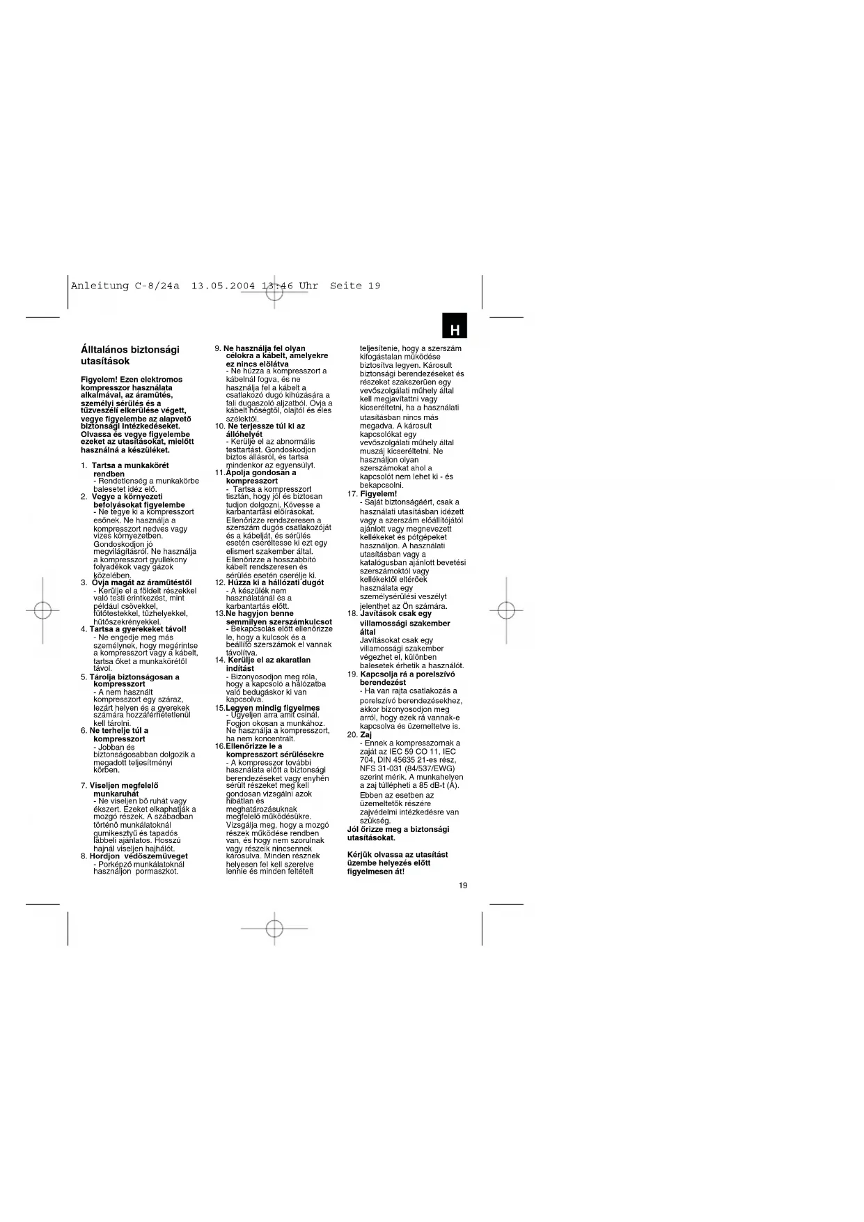 Anleitung C-8/24a 13.05.2004 13:46 Uhr Seite 1819 Álltalános biztonsági utasítások Figyelem! Ezen elektromos kompresszor használata alkalmával, az áramütés, személyi sérülés és a tűzveszélí elkerülése végett, vegye figyelembe az alapvető biztonsági intézkedéseket. Olvassa és vegye figyelembe ezeket az utasításokat, mielőtt használná a készüléket.