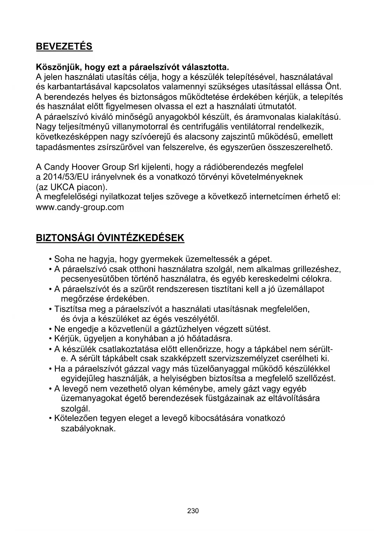 229BEVEZETÉS Köszönjük, hogy ezt a páraelszívót választotta. A jelen használati utasítás célja, hogy a készülék telepítésével, használatával és karbantartásával kapcsolatos valamennyi szükséges utasítással ellássa Önt. A berendezés helyes és biztonságos működtetése érdekében kérjük, a telepítés és használat előtt figyelmesen olvassa el ezt a használati útmutatót. A páraelszívó kiváló minőségű anyagokból készült, és áramvonalas kialakítású. Nagy teljesítményű villanymotorral és centrifugális ventilátorral rendelkezik, következésképpen nagy szívóerejű és alacsony zajszintű működésű, emellett tapadásmentes zsírszűrővel van felszerelve, és egyszerűen összeszerelhető. A Candy Hoover Group Srl kijelenti, hogy a rádióberendezés megfelel a 2014/53/EU irányelvnek és a vonatkozó törvényi követelményeknek (az UKCA piacon). A megfelelőségi nyilatkozat teljes szövege a következő internetcímen érhető el: www.candy-group.com